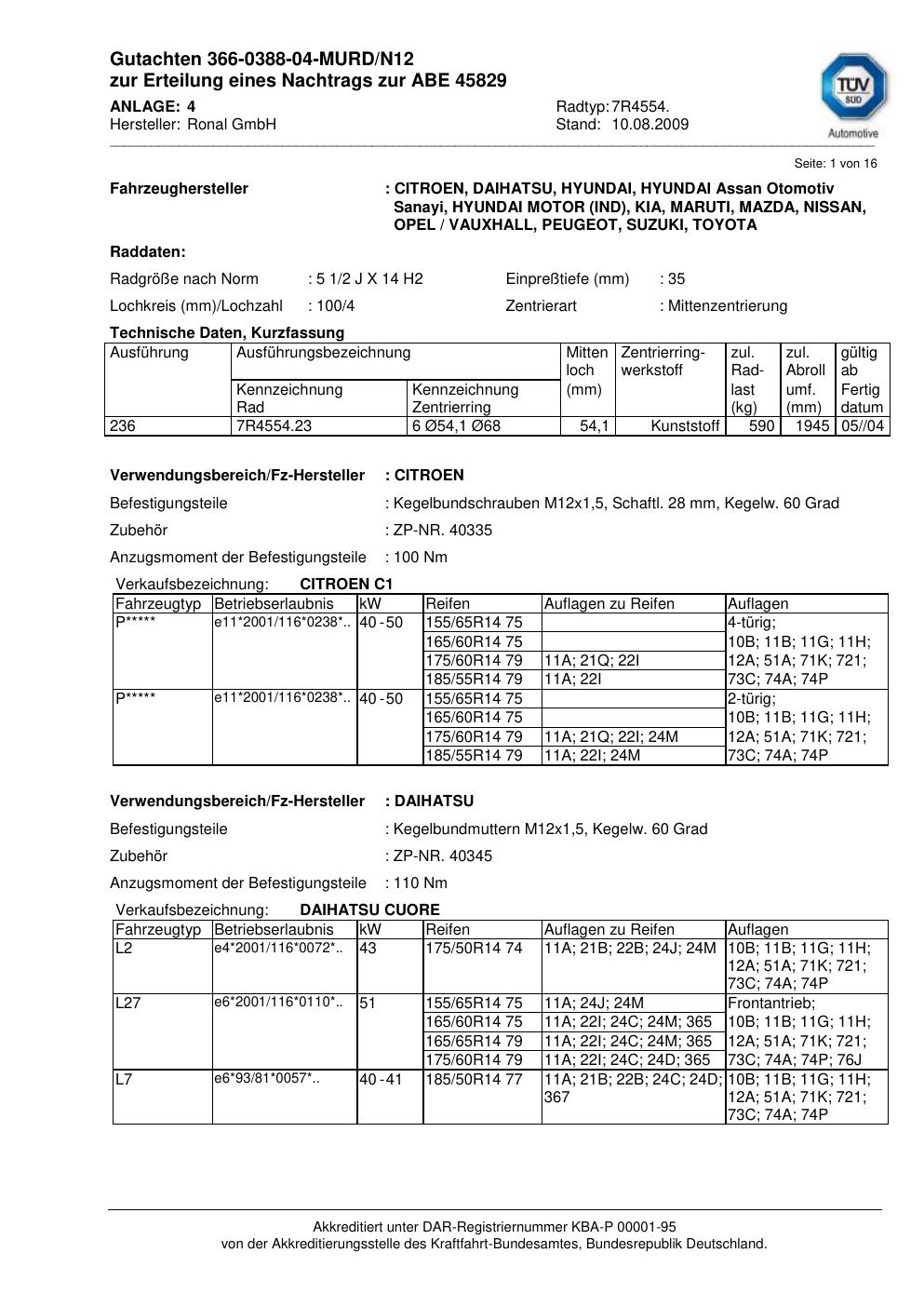 Dieses Gutachten (abe) bezieht sich auf die Alufelge Ronal 7R4554 in der Ausführung 2Jx14 ET 0, Mittenloch 0 mm (KBA 45829). Im PDF findest du typischerweise zulässige Reifengrößen, Auflagen/Anbauhinweise und – je nach Dokument – Hinweise zur Eintragung.