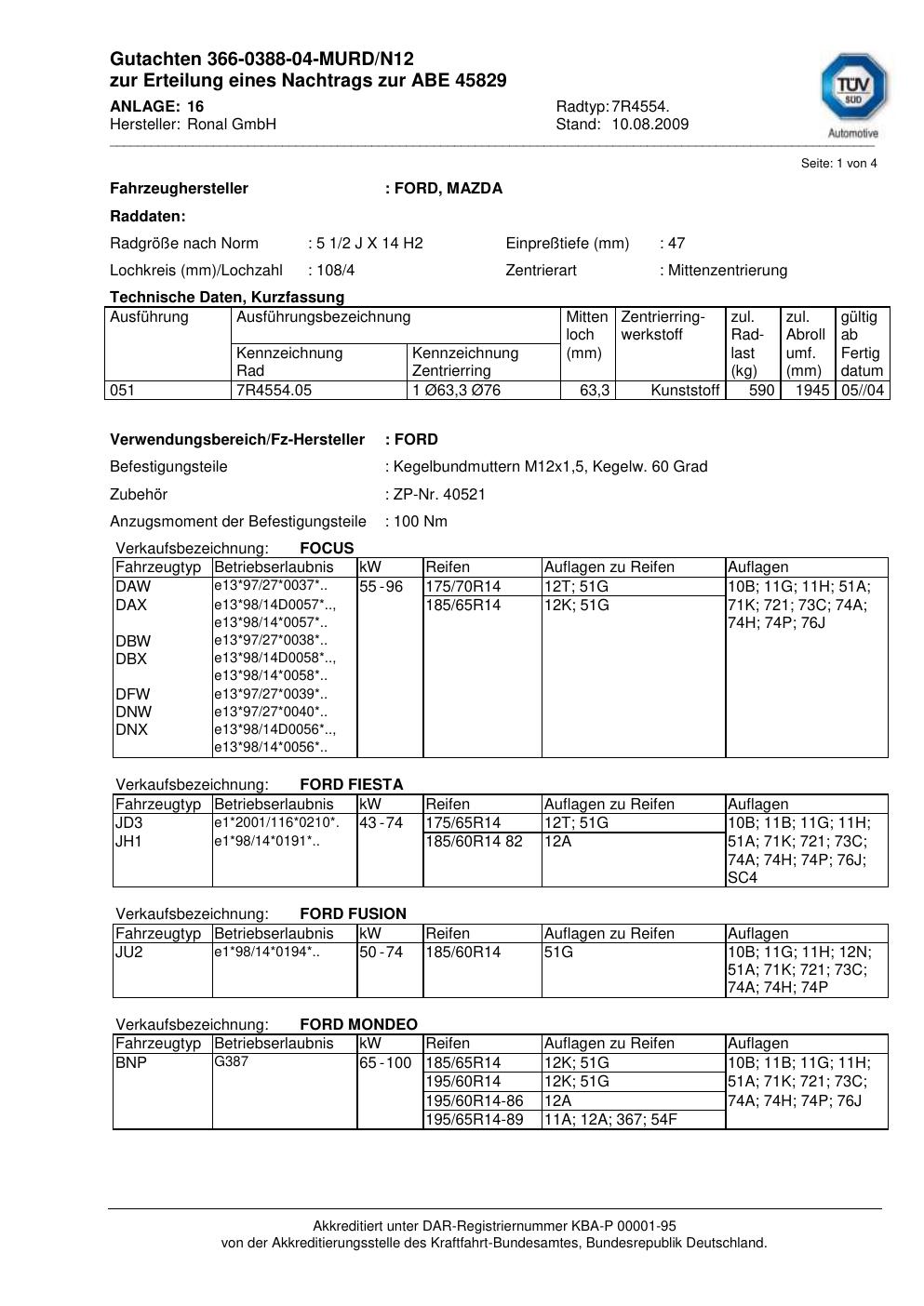 Dieses Gutachten (abe) bezieht sich auf die Alufelge Ronal 7R4554 in der Ausführung 2Jx14 ET 0, Mittenloch 0 mm (KBA 45829). Im PDF findest du typischerweise zulässige Reifengrößen, Auflagen/Anbauhinweise und – je nach Dokument – Hinweise zur Eintragung.