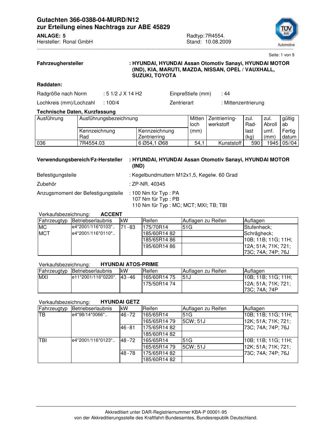 Dieses Gutachten (abe) bezieht sich auf die Alufelge Ronal 7R4554 in der Ausführung 2Jx14 ET 0, Mittenloch 0 mm (KBA 45829). Im PDF findest du typischerweise zulässige Reifengrößen, Auflagen/Anbauhinweise und – je nach Dokument – Hinweise zur Eintragung.