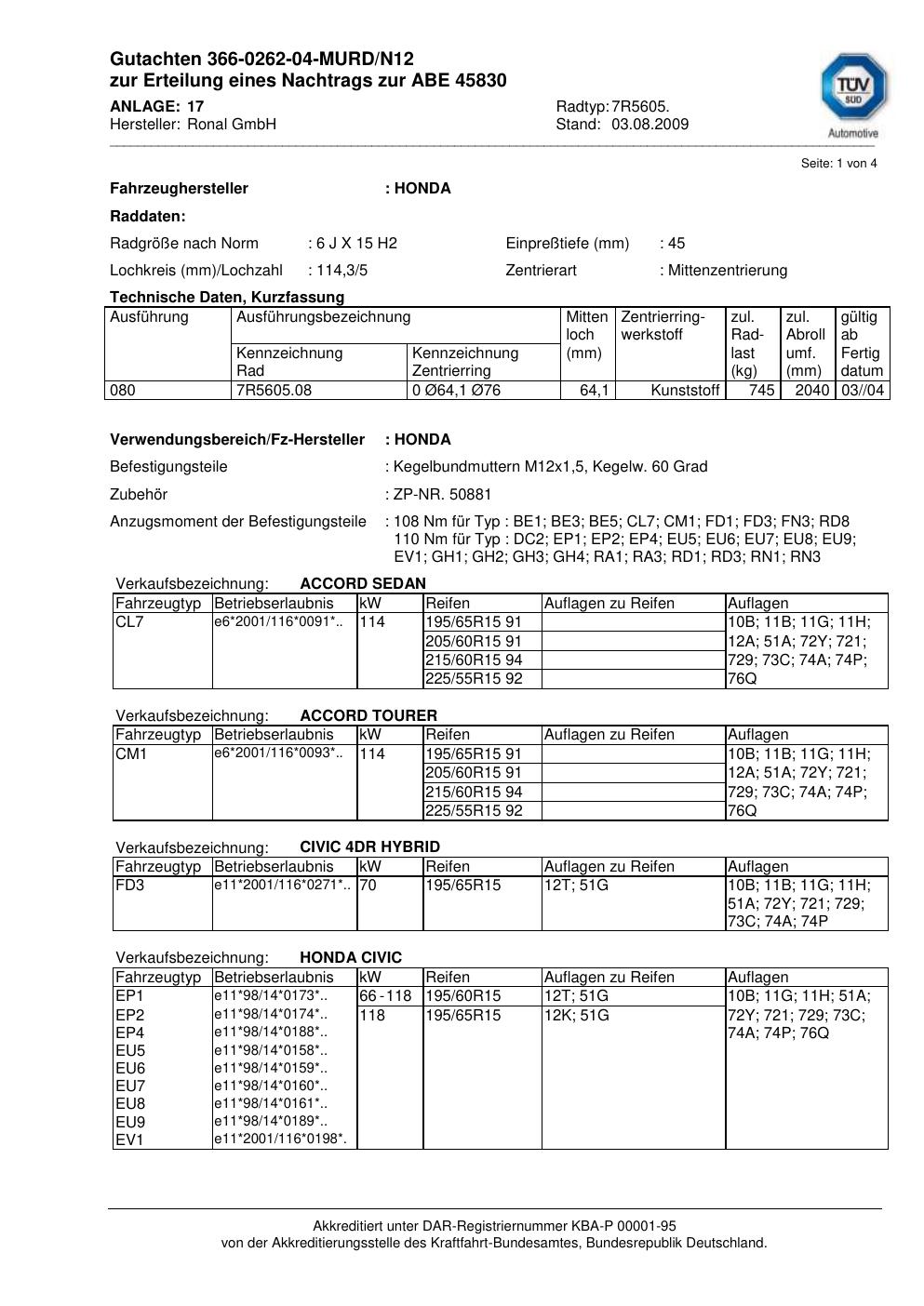 Dieses Gutachten (abe) bezieht sich auf die Alufelge Ronal 7R5605 in der Ausführung 6Jx15 ET 0, Mittenloch 0 mm (KBA 45830). Im PDF findest du typischerweise zulässige Reifengrößen, Auflagen/Anbauhinweise und – je nach Dokument – Hinweise zur Eintragung.