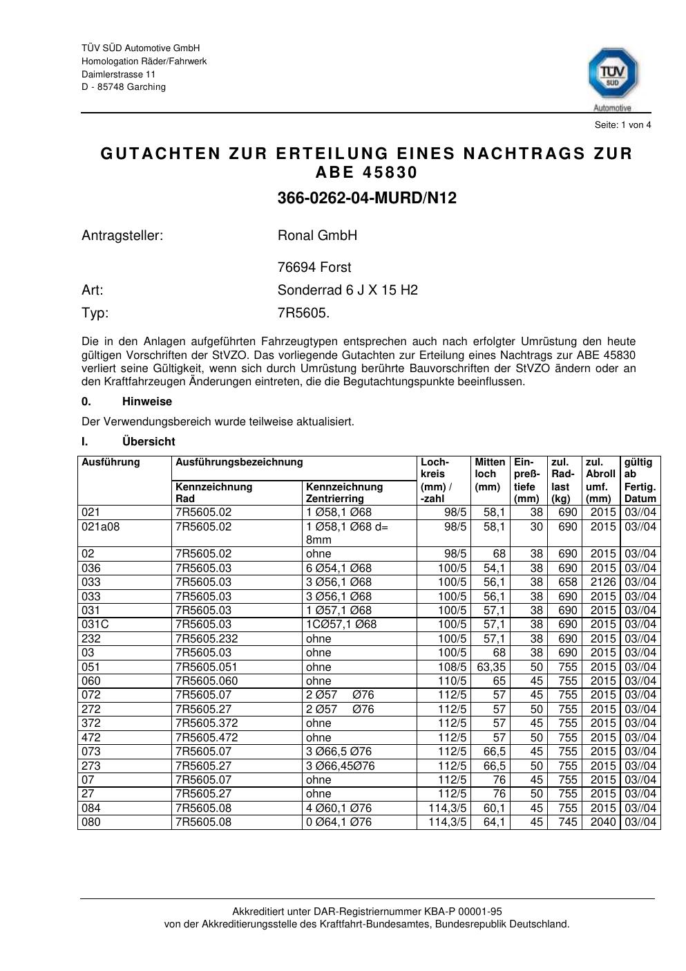 Dieses Gutachten (abe) bezieht sich auf die Alufelge Ronal 7R5605 in der Ausführung 6Jx15 ET 0, Mittenloch 0 mm (KBA 45830). Im PDF findest du typischerweise zulässige Reifengrößen, Auflagen/Anbauhinweise und – je nach Dokument – Hinweise zur Eintragung.