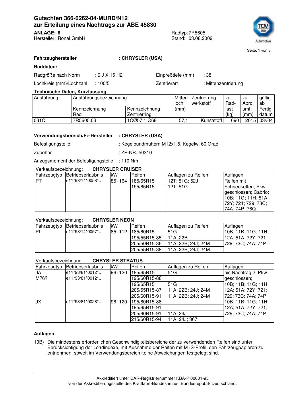 Dieses Gutachten (abe) bezieht sich auf die Alufelge Ronal 7R5605 in der Ausführung 6Jx15 ET 0, Mittenloch 0 mm (KBA 45830). Im PDF findest du typischerweise zulässige Reifengrößen, Auflagen/Anbauhinweise und – je nach Dokument – Hinweise zur Eintragung.