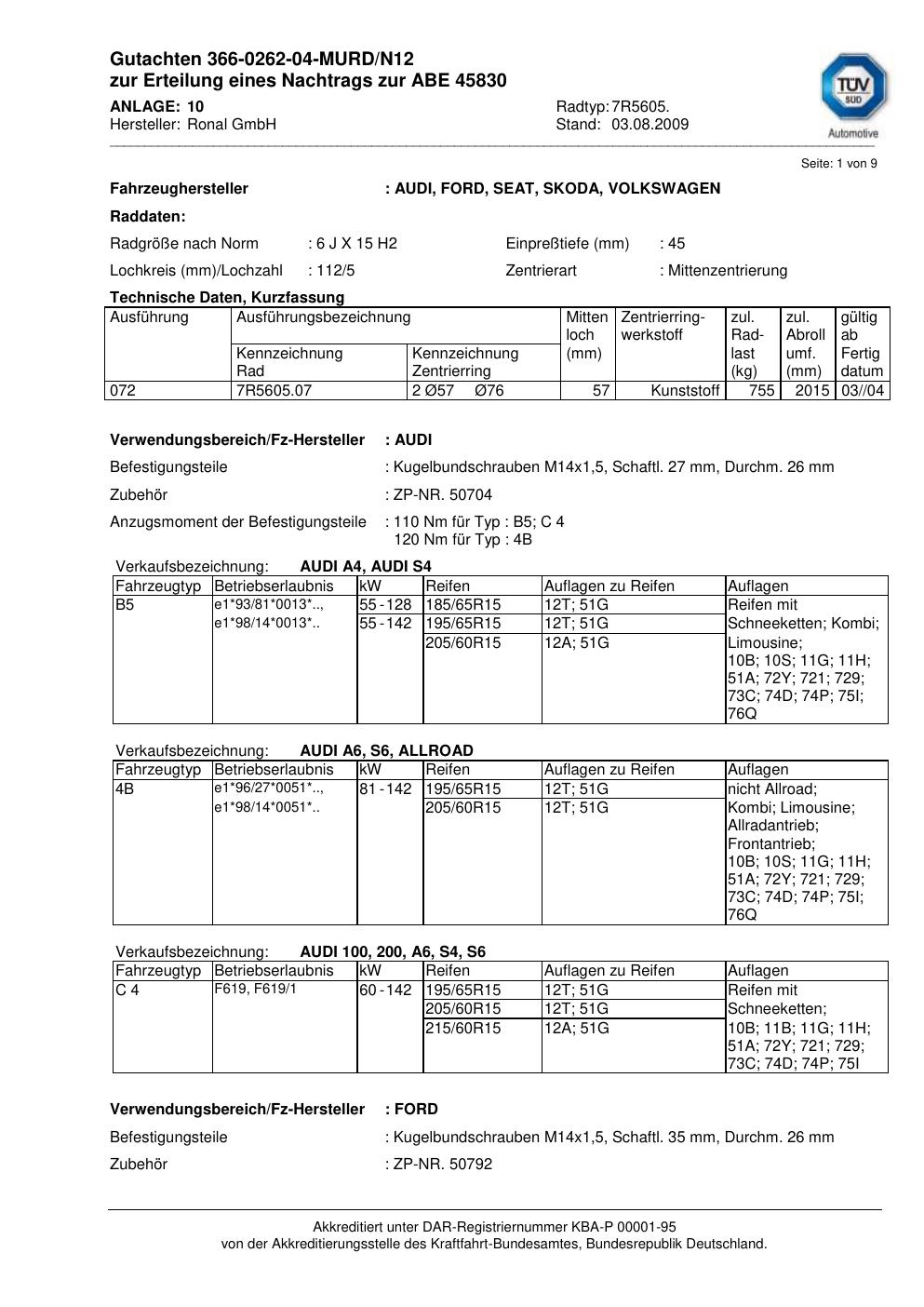 Dieses Gutachten (abe) bezieht sich auf die Alufelge Ronal 7R5605 in der Ausführung 6Jx15 ET 0, Mittenloch 0 mm (KBA 45830). Im PDF findest du typischerweise zulässige Reifengrößen, Auflagen/Anbauhinweise und – je nach Dokument – Hinweise zur Eintragung.