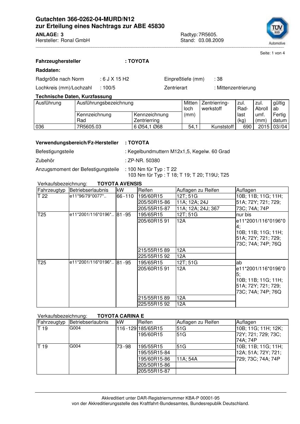 Dieses Gutachten (abe) bezieht sich auf die Alufelge Ronal 7R5605 in der Ausführung 6Jx15 ET 0, Mittenloch 0 mm (KBA 45830). Im PDF findest du typischerweise zulässige Reifengrößen, Auflagen/Anbauhinweise und – je nach Dokument – Hinweise zur Eintragung.