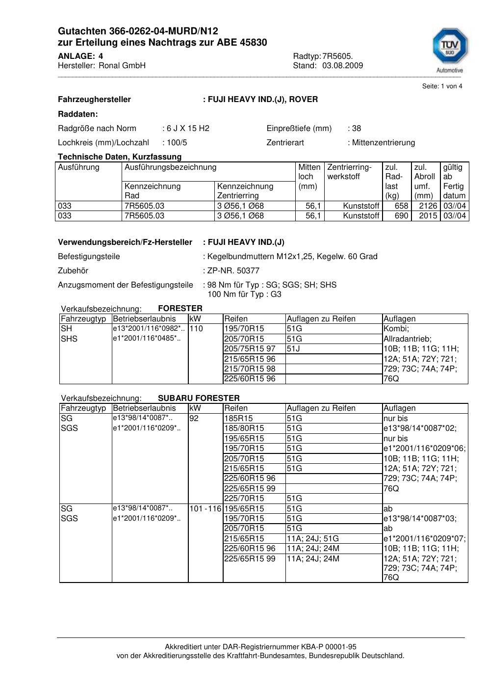 Dieses Gutachten (abe) bezieht sich auf die Alufelge Ronal 7R5605 in der Ausführung 6Jx15 ET 0, Mittenloch 0 mm (KBA 45830). Im PDF findest du typischerweise zulässige Reifengrößen, Auflagen/Anbauhinweise und – je nach Dokument – Hinweise zur Eintragung.