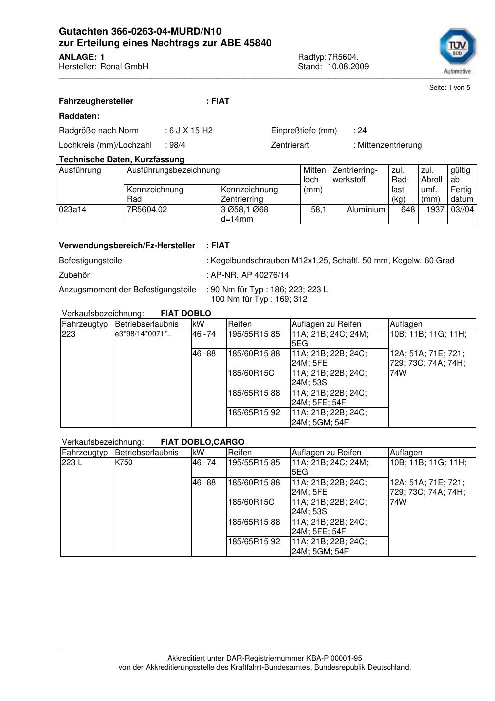 Dieses Gutachten (abe) bezieht sich auf die Alufelge Ronal 7R5604 in der Ausführung 6Jx15 ET 0, Mittenloch 0 mm (KBA 45840). Im PDF findest du typischerweise zulässige Reifengrößen, Auflagen/Anbauhinweise und – je nach Dokument – Hinweise zur Eintragung.