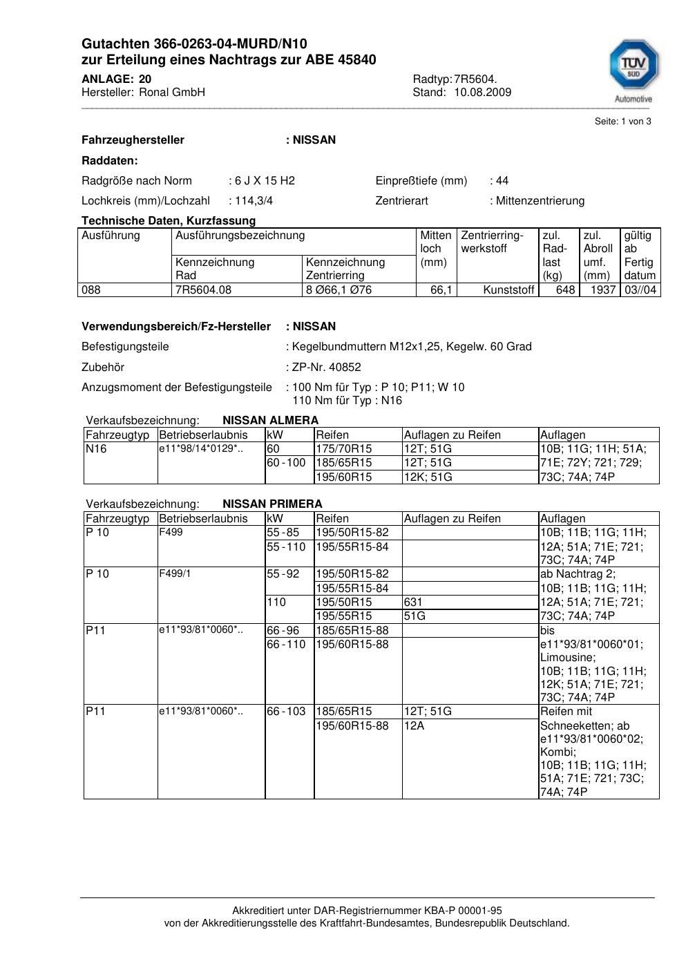Dieses Gutachten (abe) bezieht sich auf die Alufelge Ronal 7R5604 in der Ausführung 6Jx15 ET 0, Mittenloch 0 mm (KBA 45840). Im PDF findest du typischerweise zulässige Reifengrößen, Auflagen/Anbauhinweise und – je nach Dokument – Hinweise zur Eintragung.