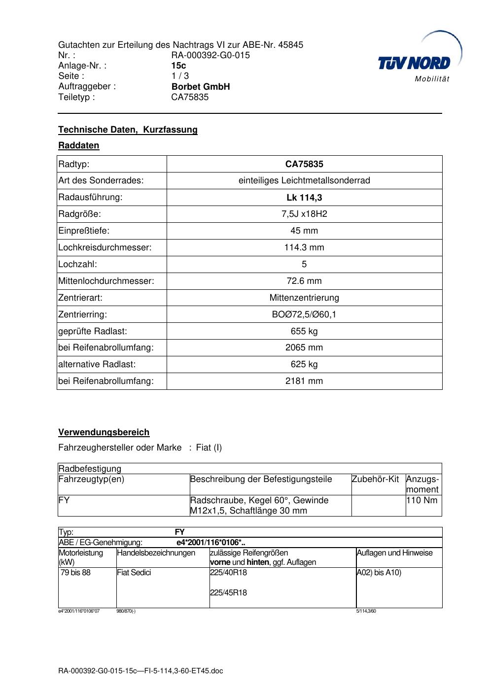 Dieses Gutachten (abe) bezieht sich auf die Alufelge brand-borbet CA75835 in der Ausführung 7.5Jx18 ET 0, Mittenloch 0 mm (KBA 45845). Im PDF findest du typischerweise zulässige Reifengrößen, Auflagen/Anbauhinweise und – je nach Dokument – Hinweise zur Eintragung.