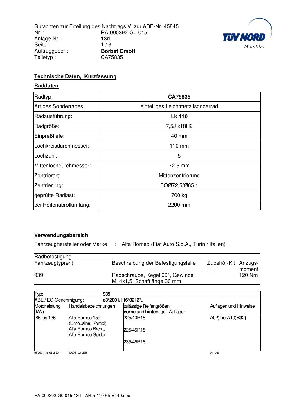 Dieses Gutachten (abe) bezieht sich auf die Alufelge brand-borbet CA75835 in der Ausführung 7.5Jx18 ET 0, Mittenloch 0 mm (KBA 45845). Im PDF findest du typischerweise zulässige Reifengrößen, Auflagen/Anbauhinweise und – je nach Dokument – Hinweise zur Eintragung.