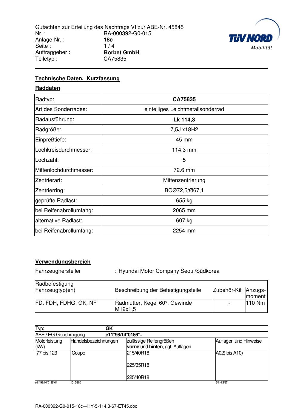 Dieses Gutachten (abe) bezieht sich auf die Alufelge brand-borbet CA75835 in der Ausführung 7.5Jx18 ET 0, Mittenloch 0 mm (KBA 45845). Im PDF findest du typischerweise zulässige Reifengrößen, Auflagen/Anbauhinweise und – je nach Dokument – Hinweise zur Eintragung.