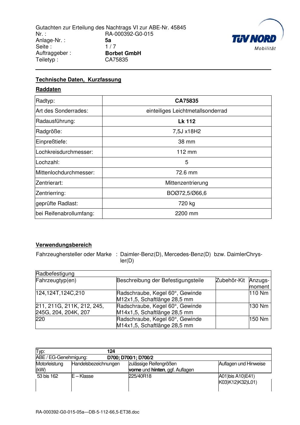 Dieses Gutachten (abe) bezieht sich auf die Alufelge brand-borbet CA75835 in der Ausführung 7.5Jx18 ET 0, Mittenloch 0 mm (KBA 45845). Im PDF findest du typischerweise zulässige Reifengrößen, Auflagen/Anbauhinweise und – je nach Dokument – Hinweise zur Eintragung.