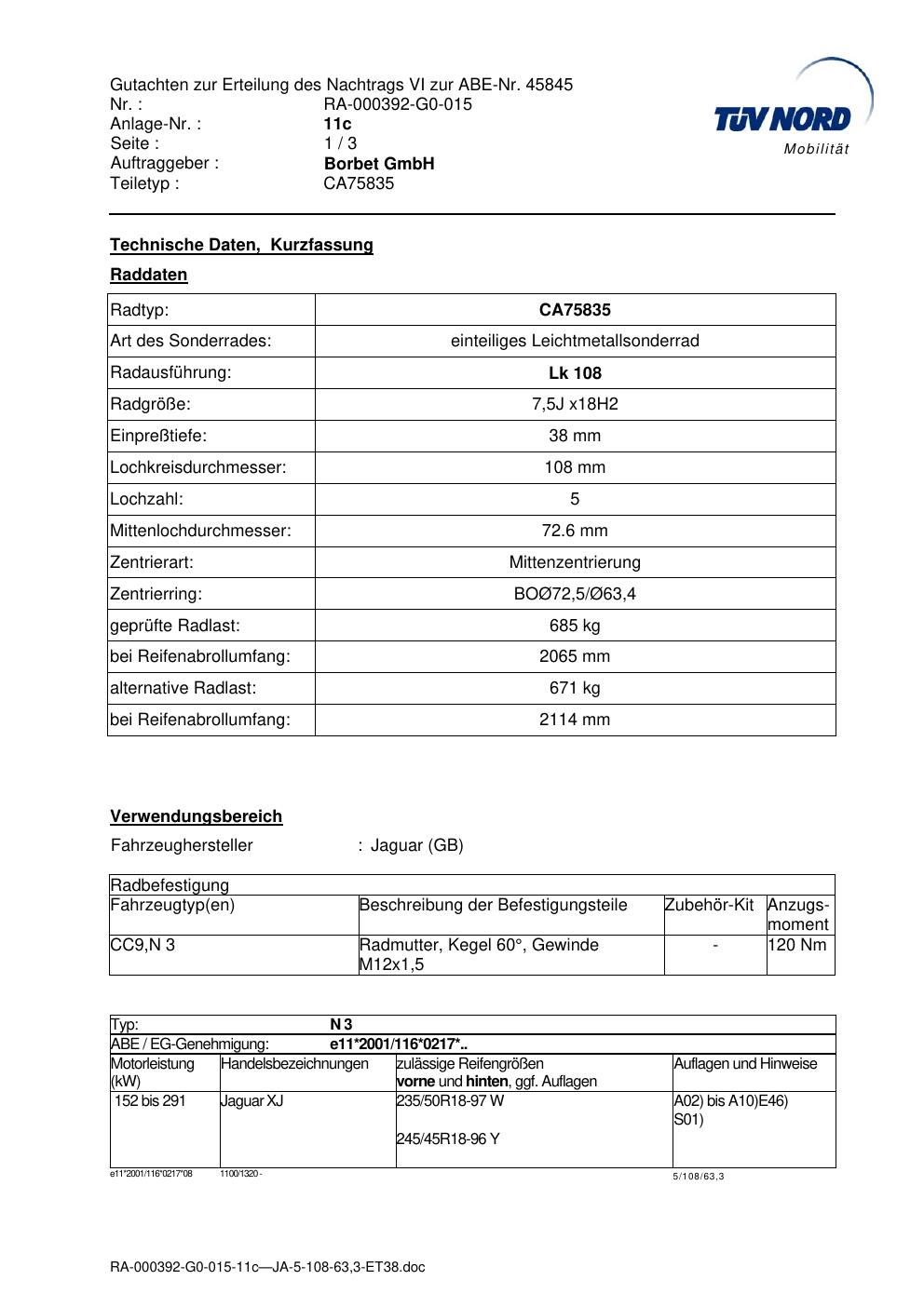 Dieses Gutachten (abe) bezieht sich auf die Alufelge brand-borbet CA75835 in der Ausführung 7.5Jx18 ET 0, Mittenloch 0 mm (KBA 45845). Im PDF findest du typischerweise zulässige Reifengrößen, Auflagen/Anbauhinweise und – je nach Dokument – Hinweise zur Eintragung.