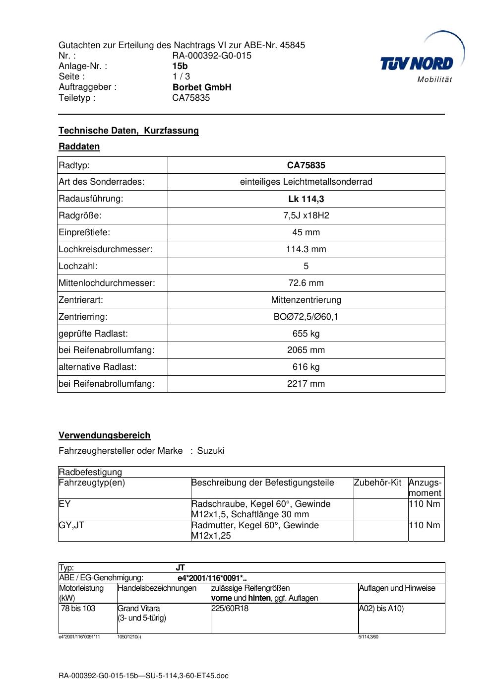 Dieses Gutachten (abe) bezieht sich auf die Alufelge brand-borbet CA75835 in der Ausführung 7.5Jx18 ET 0, Mittenloch 0 mm (KBA 45845). Im PDF findest du typischerweise zulässige Reifengrößen, Auflagen/Anbauhinweise und – je nach Dokument – Hinweise zur Eintragung.