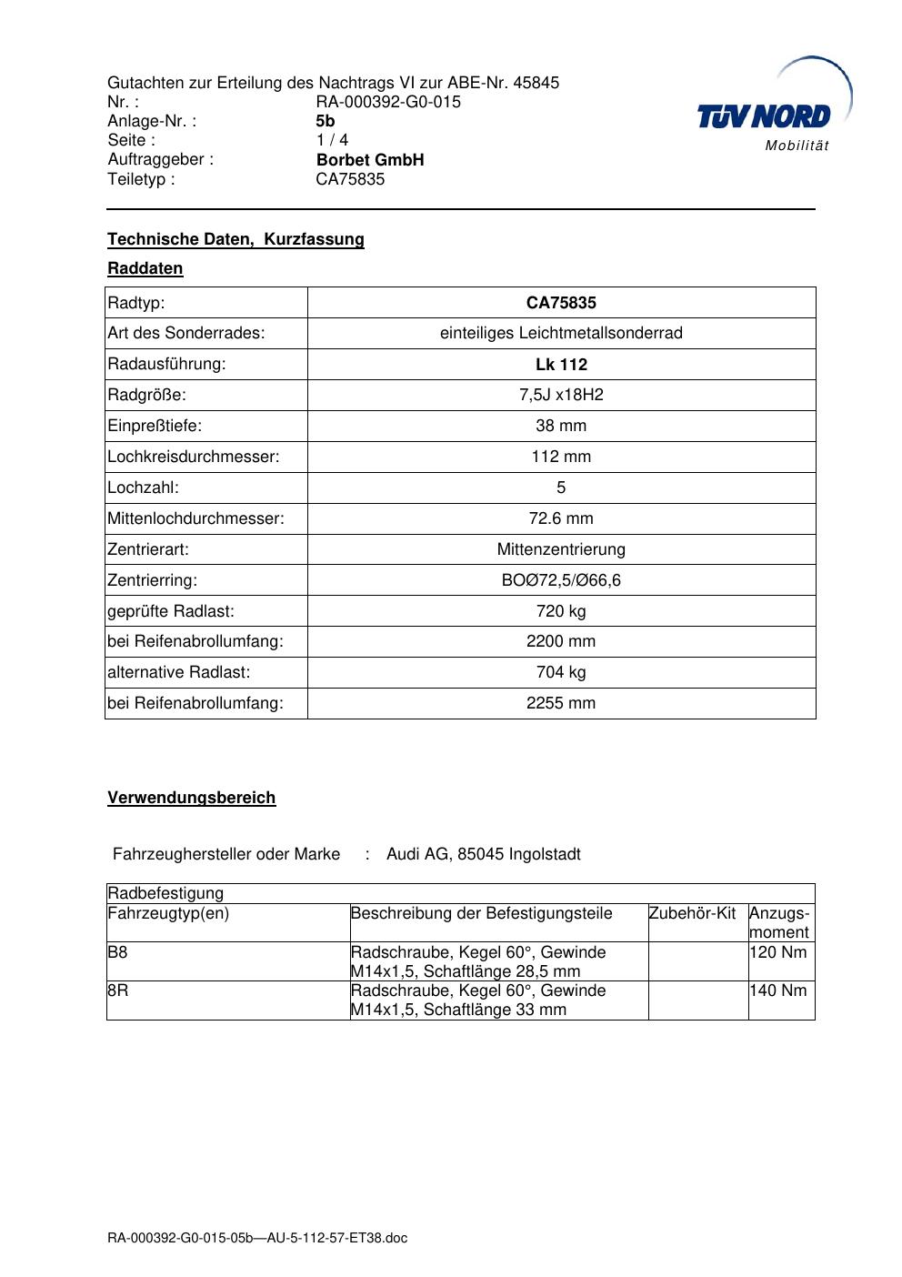 Dieses Gutachten (abe) bezieht sich auf die Alufelge brand-borbet CA75835 in der Ausführung 7.5Jx18 ET 0, Mittenloch 0 mm (KBA 45845). Im PDF findest du typischerweise zulässige Reifengrößen, Auflagen/Anbauhinweise und – je nach Dokument – Hinweise zur Eintragung.