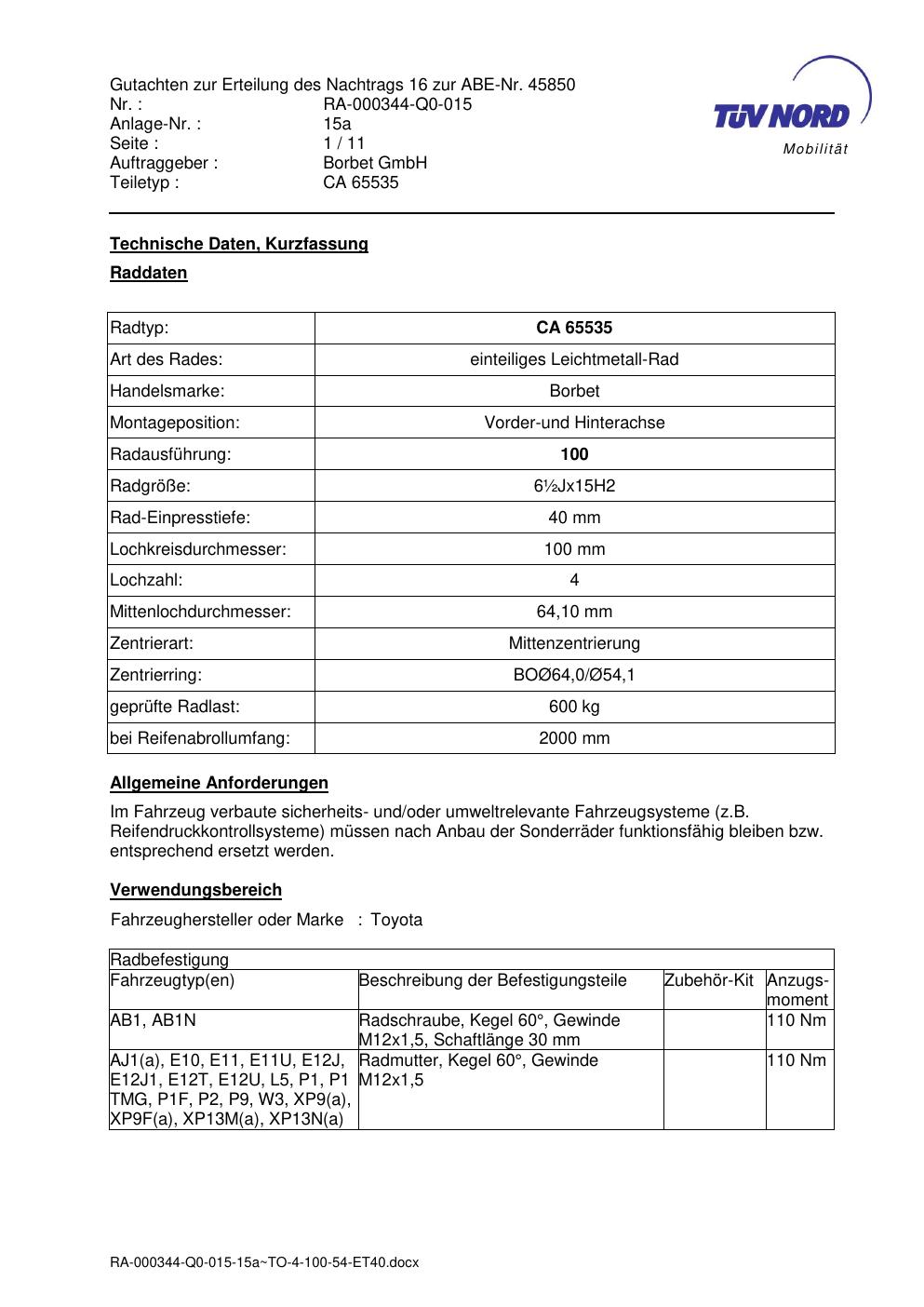 Dieses Gutachten (abe) bezieht sich auf die Alufelge ATS CA 65535 in der Ausführung ET 0, Mittenloch 0 mm (KBA 45850). Im PDF findest du typischerweise zulässige Reifengrößen, Auflagen/Anbauhinweise und – je nach Dokument – Hinweise zur Eintragung.