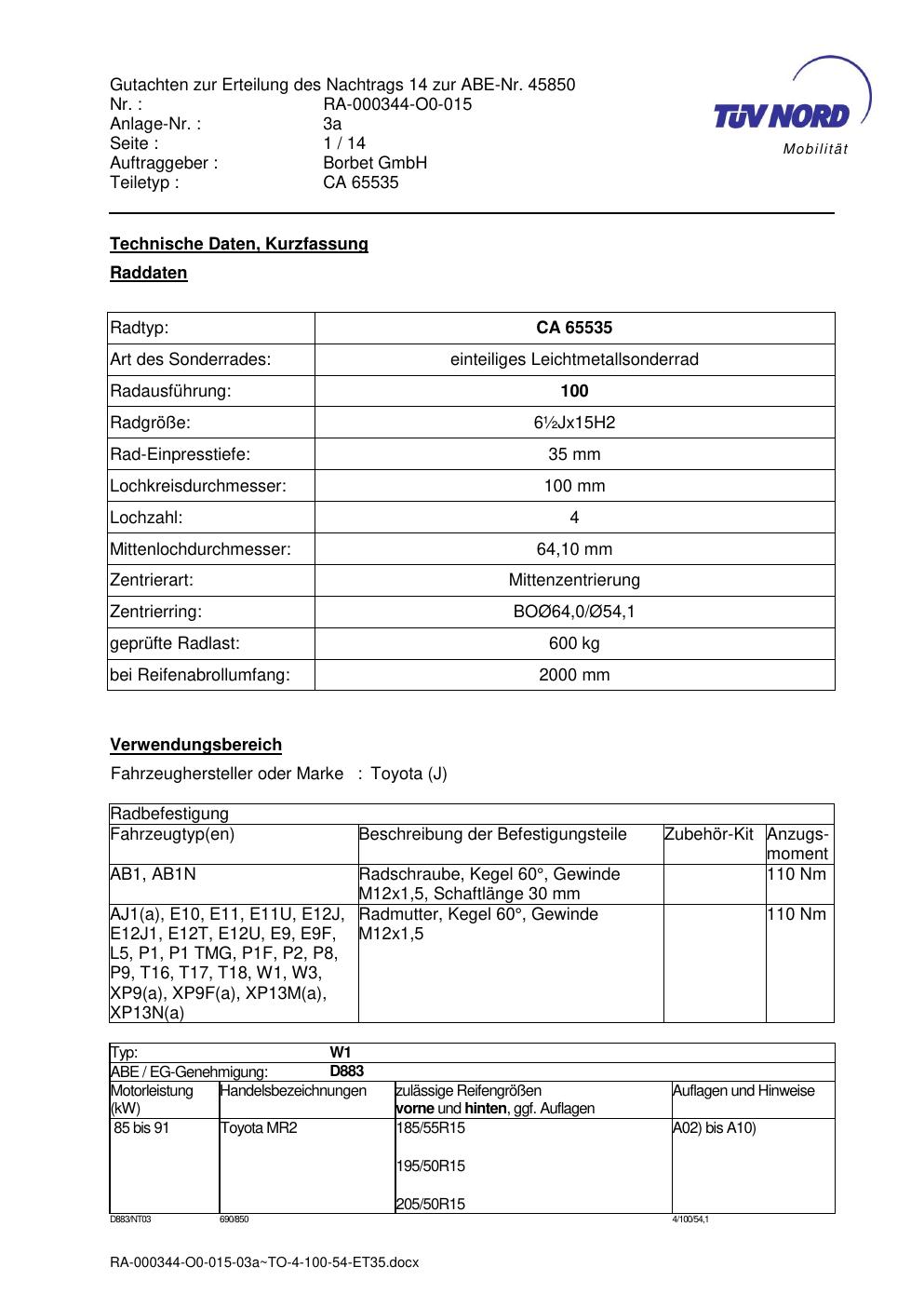 Dieses Gutachten (abe) bezieht sich auf die Alufelge ATS CA 65535 in der Ausführung ET 0, Mittenloch 0 mm (KBA 45850). Im PDF findest du typischerweise zulässige Reifengrößen, Auflagen/Anbauhinweise und – je nach Dokument – Hinweise zur Eintragung.