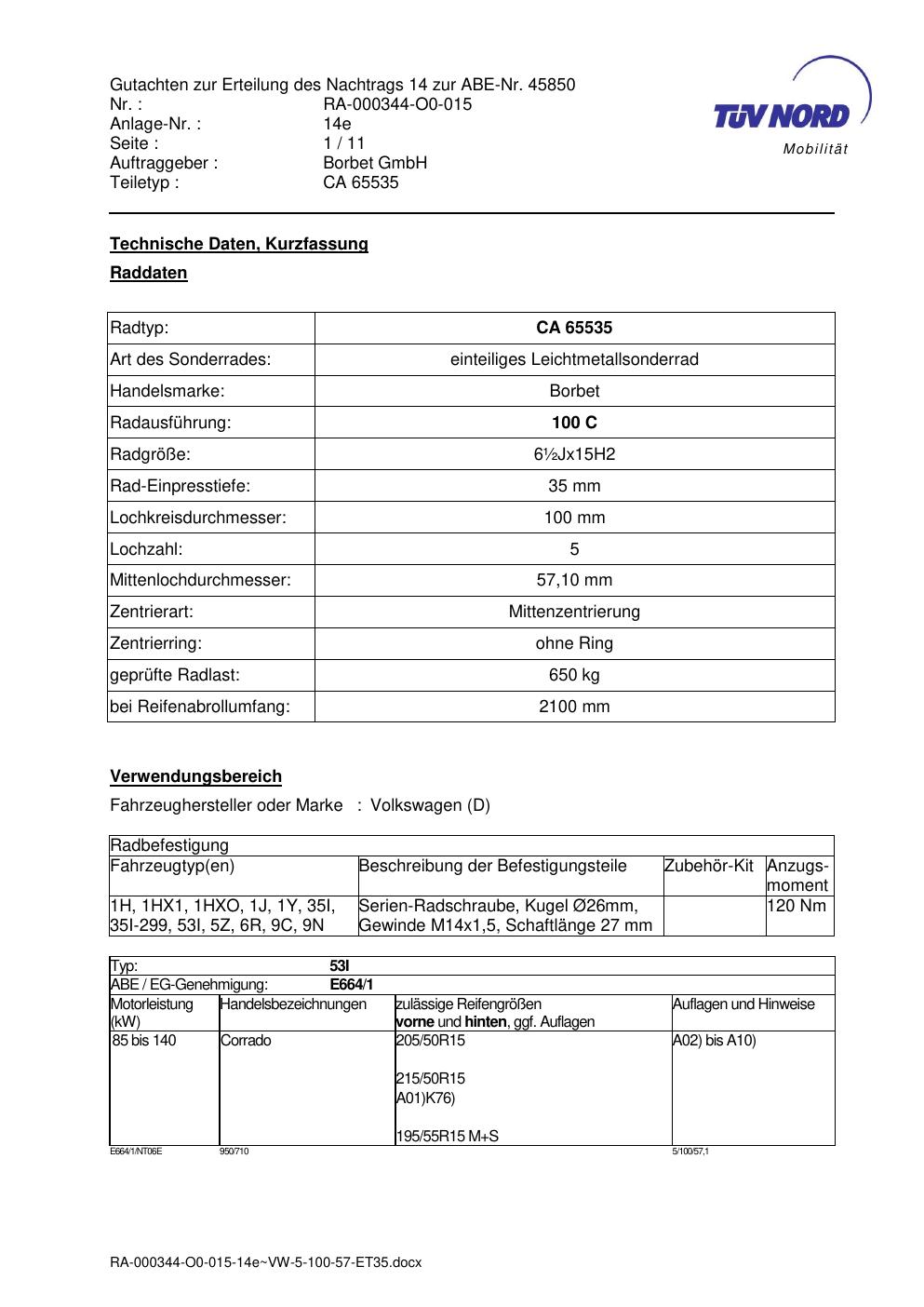 Dieses Gutachten (abe) bezieht sich auf die Alufelge Borbet CA 65535 in der Ausführung ET 0, Mittenloch 0 mm (KBA 45850). Im PDF findest du typischerweise zulässige Reifengrößen, Auflagen/Anbauhinweise und – je nach Dokument – Hinweise zur Eintragung.