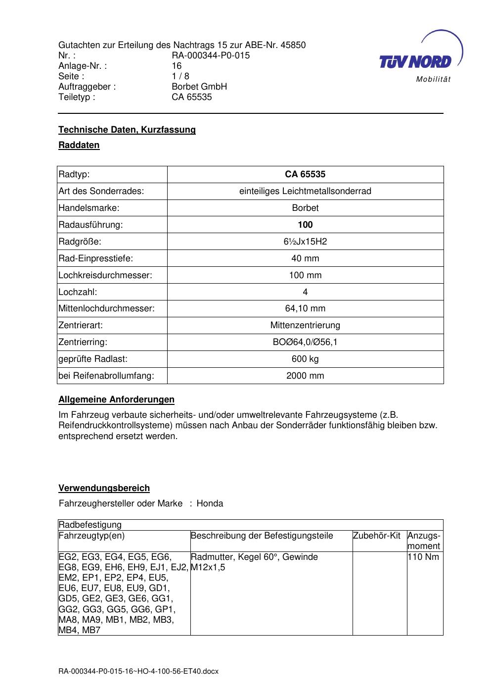 Dieses Gutachten (abe) bezieht sich auf die Alufelge Borbet CA 65535 in der Ausführung ET 0, Mittenloch 0 mm (KBA 45850). Im PDF findest du typischerweise zulässige Reifengrößen, Auflagen/Anbauhinweise und – je nach Dokument – Hinweise zur Eintragung.