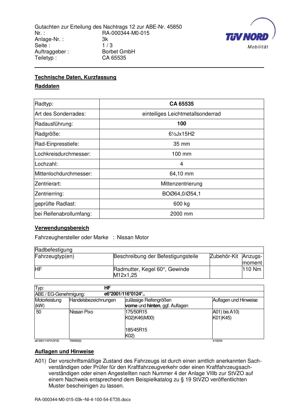 Dieses Gutachten (abe) bezieht sich auf die Alufelge Borbet CA 65535 in der Ausführung ET 0, Mittenloch 0 mm (KBA 45850). Im PDF findest du typischerweise zulässige Reifengrößen, Auflagen/Anbauhinweise und – je nach Dokument – Hinweise zur Eintragung.