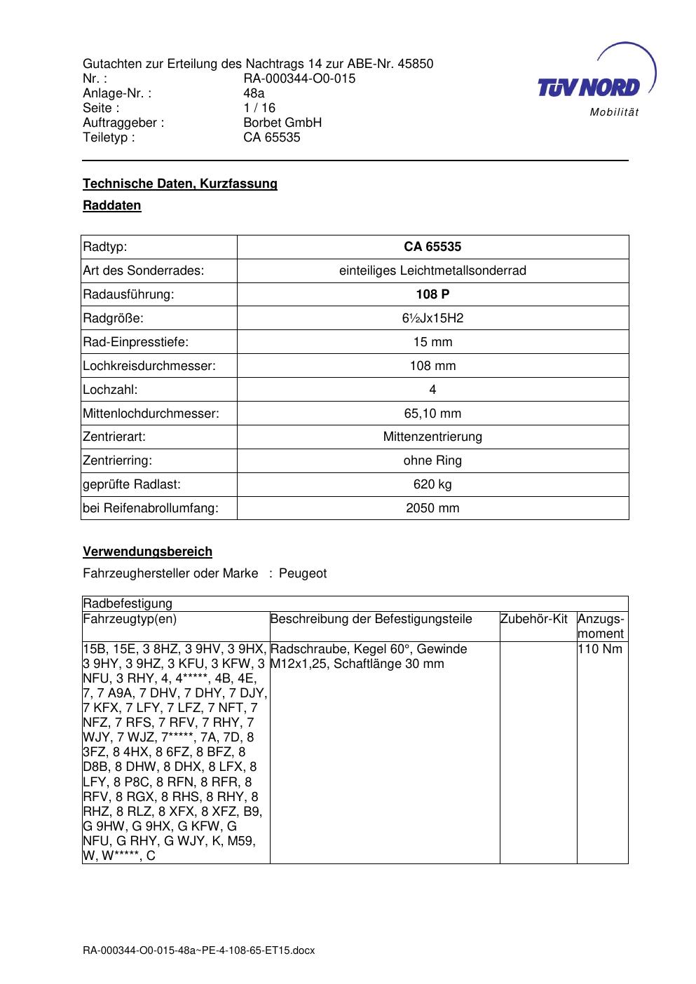 Dieses Gutachten (abe) bezieht sich auf die Alufelge Borbet CA 65535 in der Ausführung ET 0, Mittenloch 0 mm (KBA 45850). Im PDF findest du typischerweise zulässige Reifengrößen, Auflagen/Anbauhinweise und – je nach Dokument – Hinweise zur Eintragung.