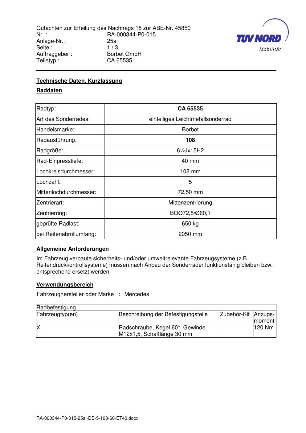 Dieses Gutachten (abe) bezieht sich auf die Alufelge Borbet CA 65535 in der Ausführung ET 0, Mittenloch 0 mm (KBA 45850). Im PDF findest du typischerweise zulässige Reifengrößen, Auflagen/Anbauhinweise und – je nach Dokument – Hinweise zur Eintragung.