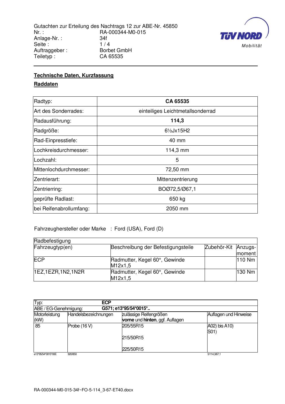 Dieses Gutachten (abe) bezieht sich auf die Alufelge Borbet CA 65535 in der Ausführung ET 0, Mittenloch 0 mm (KBA 45850). Im PDF findest du typischerweise zulässige Reifengrößen, Auflagen/Anbauhinweise und – je nach Dokument – Hinweise zur Eintragung.