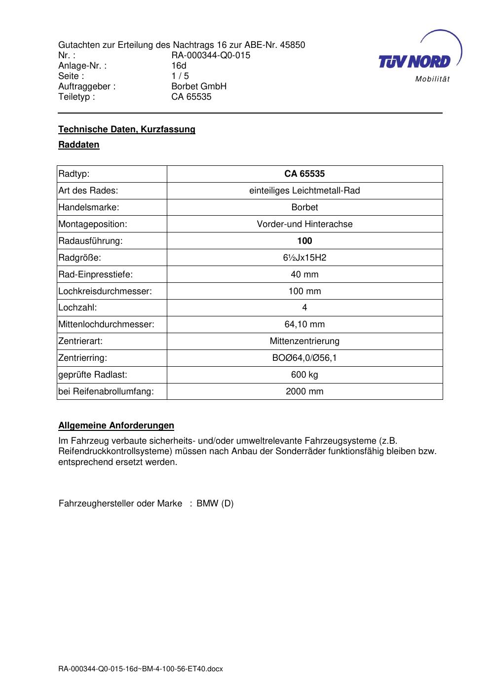 Dieses Gutachten (abe) bezieht sich auf die Alufelge Borbet CA 65535 in der Ausführung ET 0, Mittenloch 0 mm (KBA 45850). Im PDF findest du typischerweise zulässige Reifengrößen, Auflagen/Anbauhinweise und – je nach Dokument – Hinweise zur Eintragung.