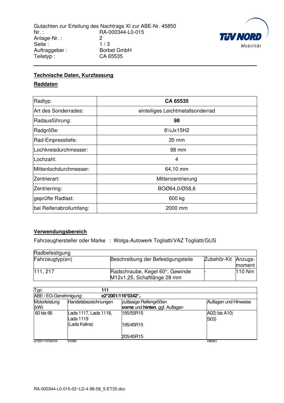 Dieses Gutachten (abe) bezieht sich auf die Alufelge Borbet CA 65535 in der Ausführung ET 0, Mittenloch 0 mm (KBA 45850). Im PDF findest du typischerweise zulässige Reifengrößen, Auflagen/Anbauhinweise und – je nach Dokument – Hinweise zur Eintragung.
