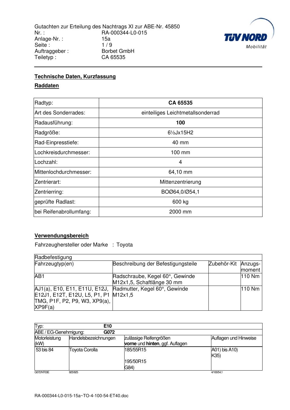 Dieses Gutachten (abe) bezieht sich auf die Alufelge Borbet CA 65535 in der Ausführung ET 0, Mittenloch 0 mm (KBA 45850). Im PDF findest du typischerweise zulässige Reifengrößen, Auflagen/Anbauhinweise und – je nach Dokument – Hinweise zur Eintragung.