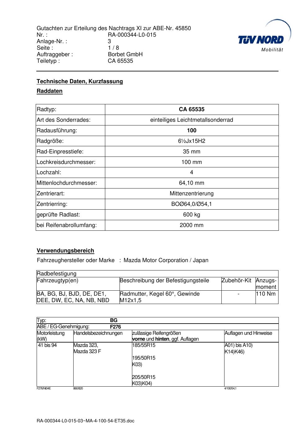 Dieses Gutachten (abe) bezieht sich auf die Alufelge Borbet CA 65535 in der Ausführung ET 0, Mittenloch 0 mm (KBA 45850). Im PDF findest du typischerweise zulässige Reifengrößen, Auflagen/Anbauhinweise und – je nach Dokument – Hinweise zur Eintragung.