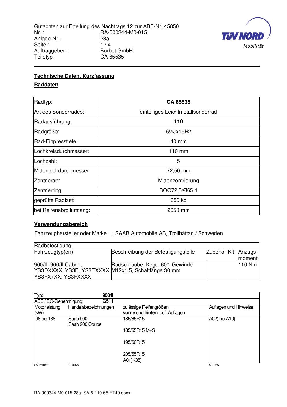 Dieses Gutachten (abe) bezieht sich auf die Alufelge Borbet CA 65535 in der Ausführung ET 0, Mittenloch 0 mm (KBA 45850). Im PDF findest du typischerweise zulässige Reifengrößen, Auflagen/Anbauhinweise und – je nach Dokument – Hinweise zur Eintragung.