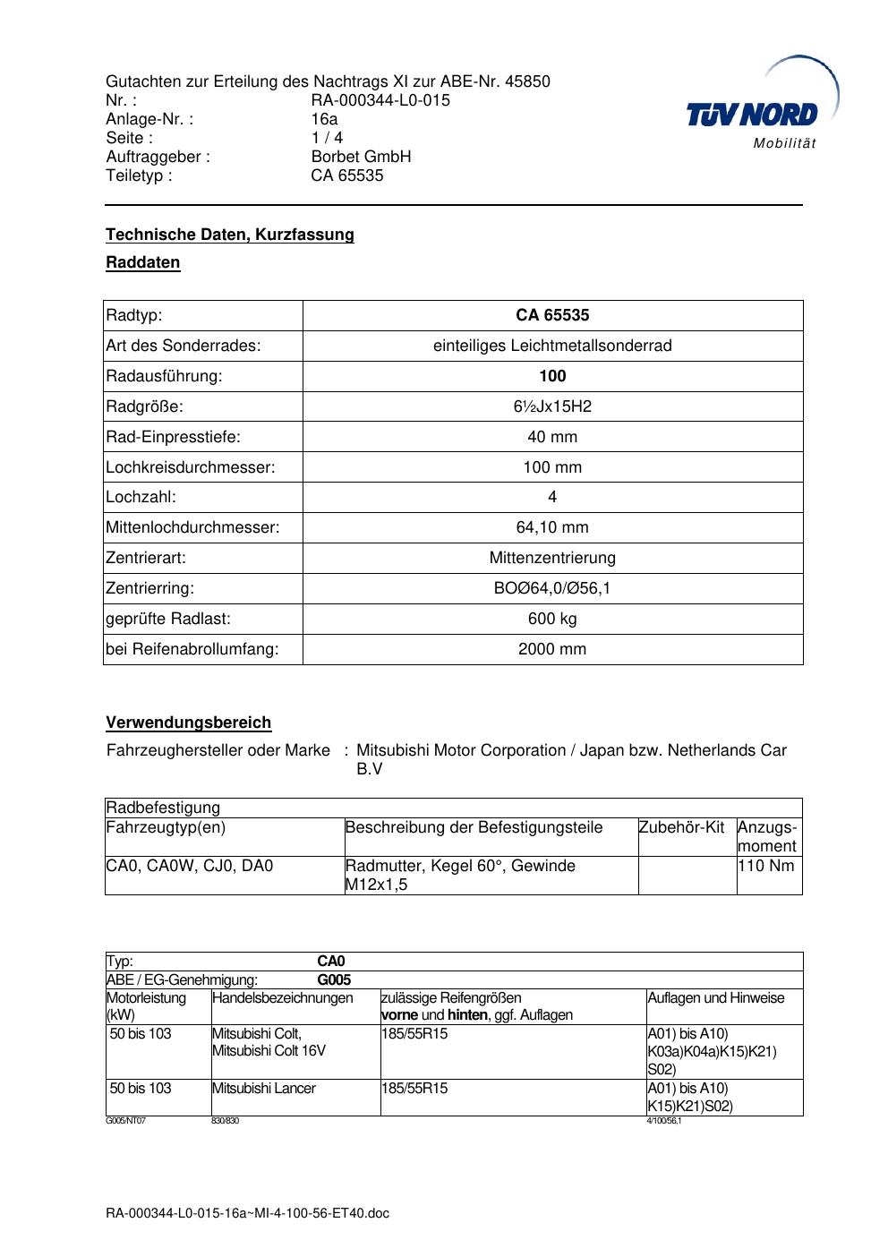 • Stimmt die KBA-Nummer auf der Felge mit diesem Dokument überein?