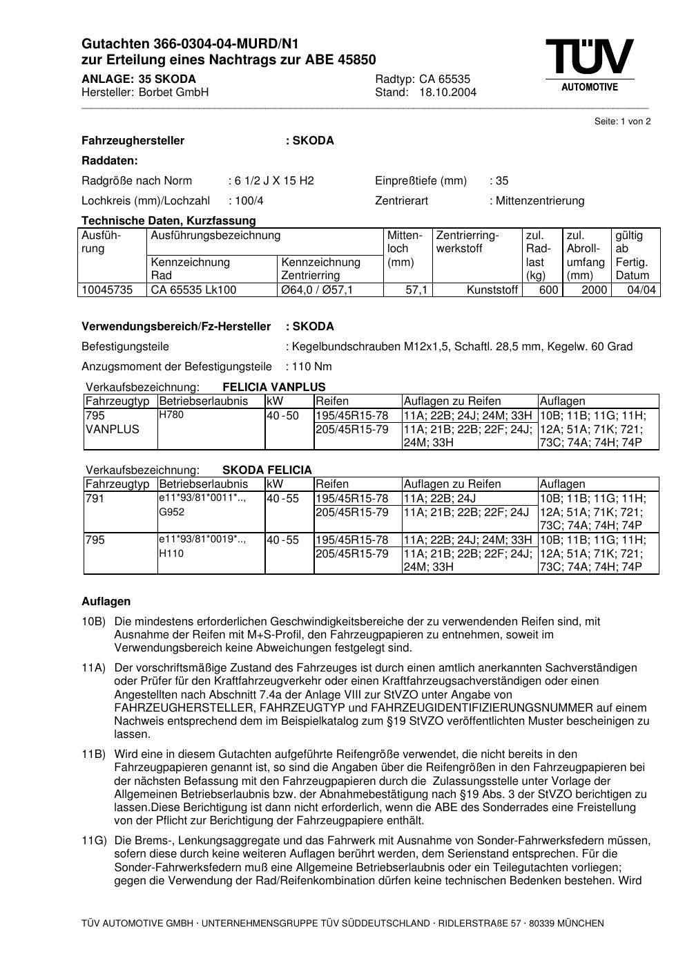 Dieses Gutachten (abe) bezieht sich auf die Alufelge Borbet CA 65535 in der Ausführung 2Jx15 ET 0, Mittenloch 0 mm (KBA 45850). Im PDF findest du typischerweise zulässige Reifengrößen, Auflagen/Anbauhinweise und – je nach Dokument – Hinweise zur Eintragung.