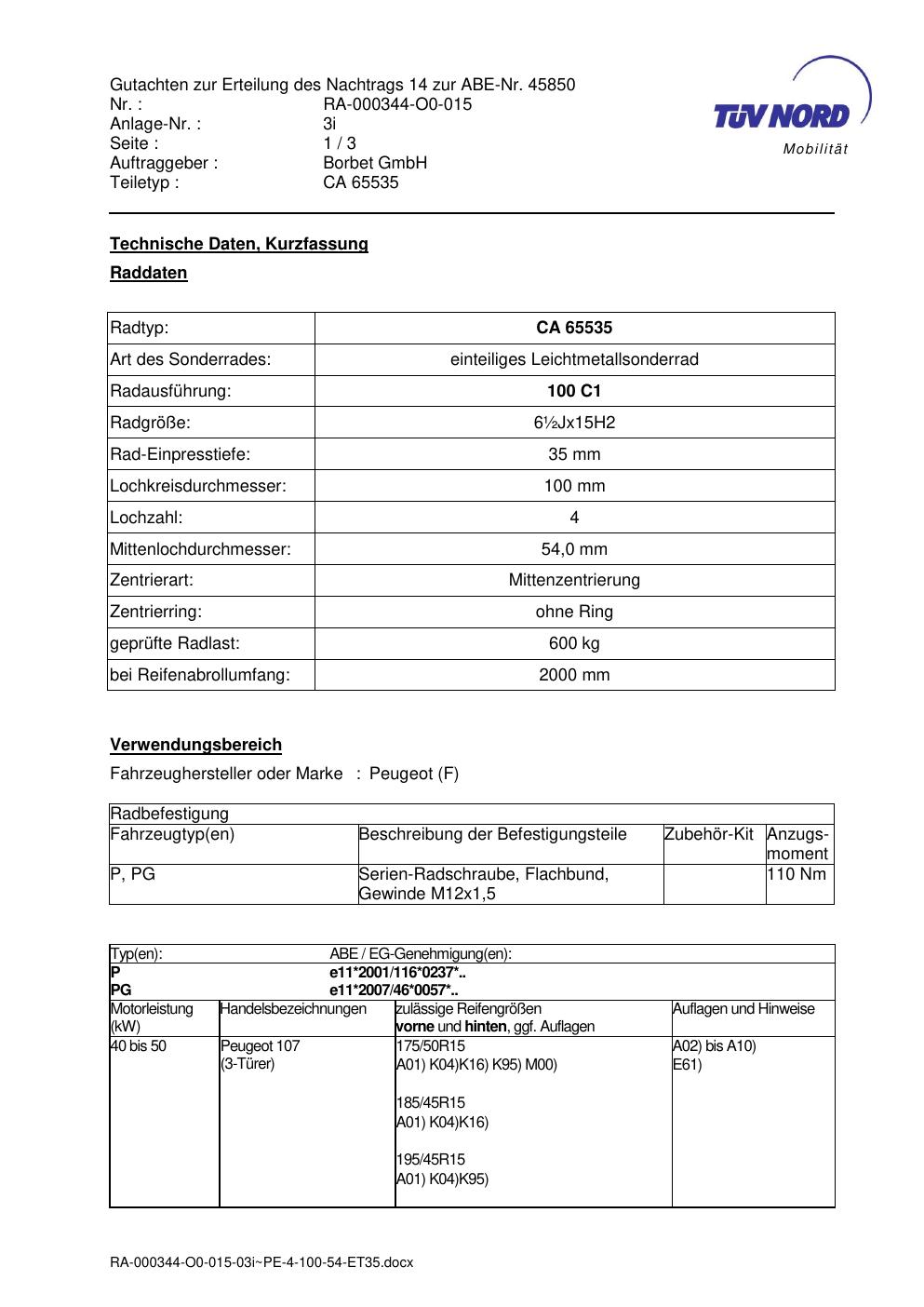 Dieses Gutachten (abe) bezieht sich auf die Alufelge Borbet CA 65535 in der Ausführung ET 0, Mittenloch 0 mm (KBA 45850). Im PDF findest du typischerweise zulässige Reifengrößen, Auflagen/Anbauhinweise und – je nach Dokument – Hinweise zur Eintragung.