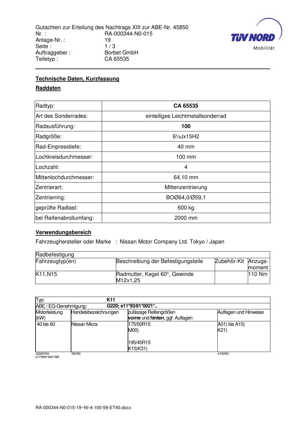 Dieses Gutachten (abe) bezieht sich auf die Alufelge Borbet CA 65535 in der Ausführung ET 0, Mittenloch 0 mm (KBA 45850). Im PDF findest du typischerweise zulässige Reifengrößen, Auflagen/Anbauhinweise und – je nach Dokument – Hinweise zur Eintragung.