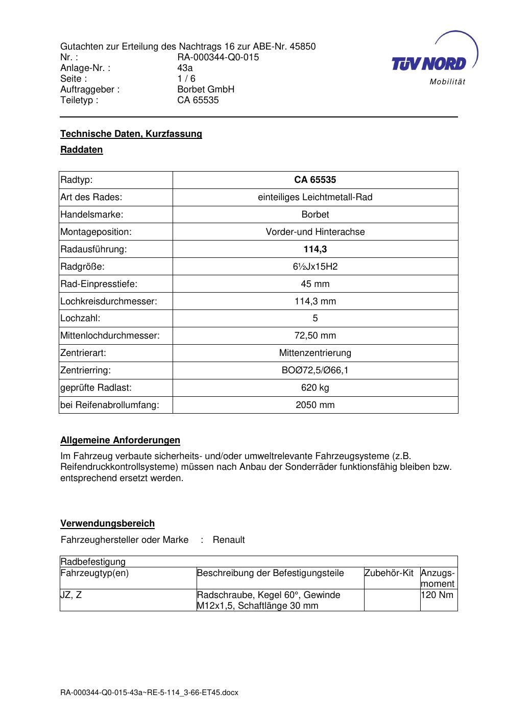 Dieses Gutachten (abe) bezieht sich auf die Alufelge Borbet CA 65535 in der Ausführung ET 0, Mittenloch 0 mm (KBA 45850). Im PDF findest du typischerweise zulässige Reifengrößen, Auflagen/Anbauhinweise und – je nach Dokument – Hinweise zur Eintragung.