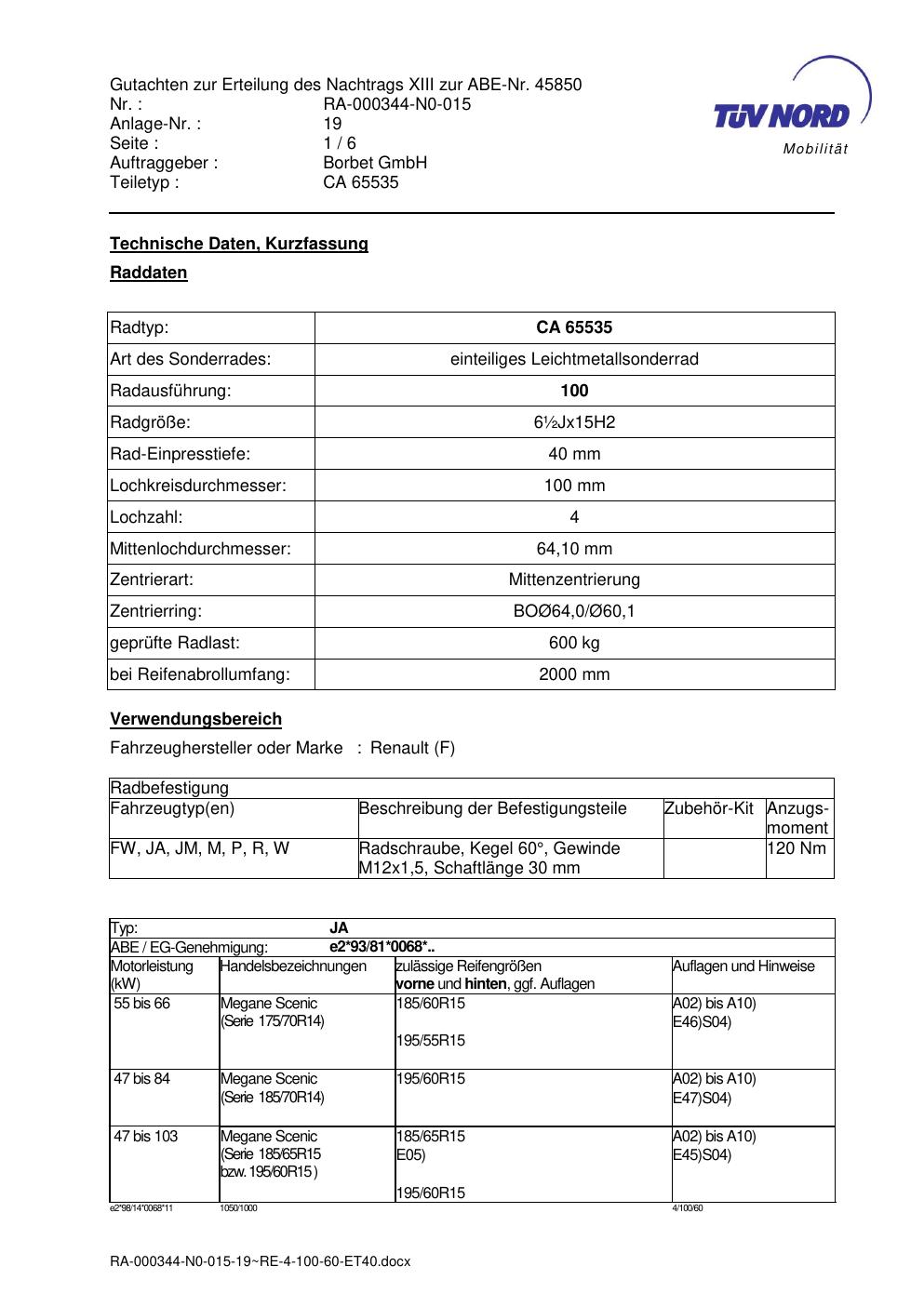 Dieses Gutachten (abe) bezieht sich auf die Alufelge brand-borbet CA 65535 in der Ausführung ET 0, Mittenloch 0 mm (KBA 45850). Im PDF findest du typischerweise zulässige Reifengrößen, Auflagen/Anbauhinweise und – je nach Dokument – Hinweise zur Eintragung.