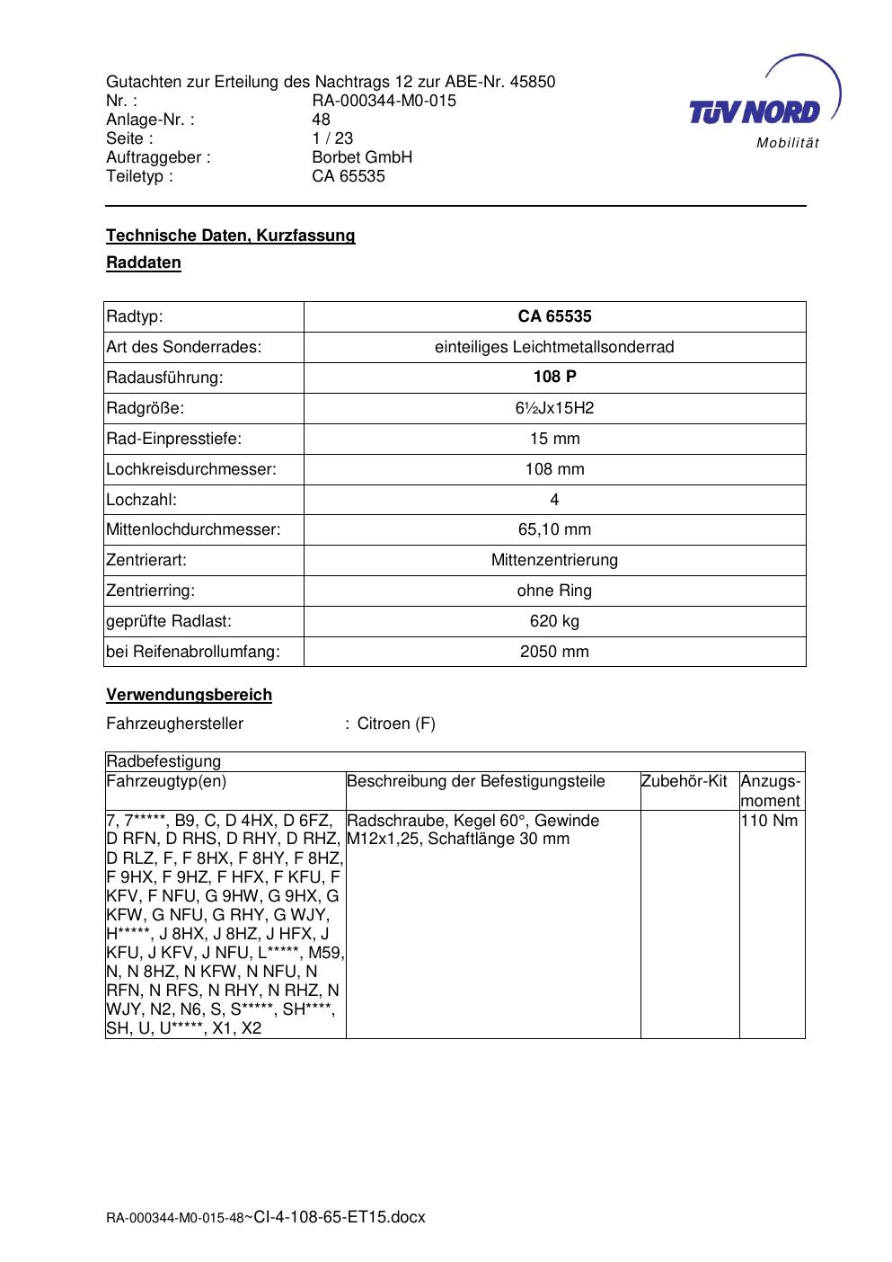 Dieses Gutachten (abe) bezieht sich auf die Alufelge Borbet CA 65535 in der Ausführung ET 0, Mittenloch 0 mm (KBA 45850). Im PDF findest du typischerweise zulässige Reifengrößen, Auflagen/Anbauhinweise und – je nach Dokument – Hinweise zur Eintragung.