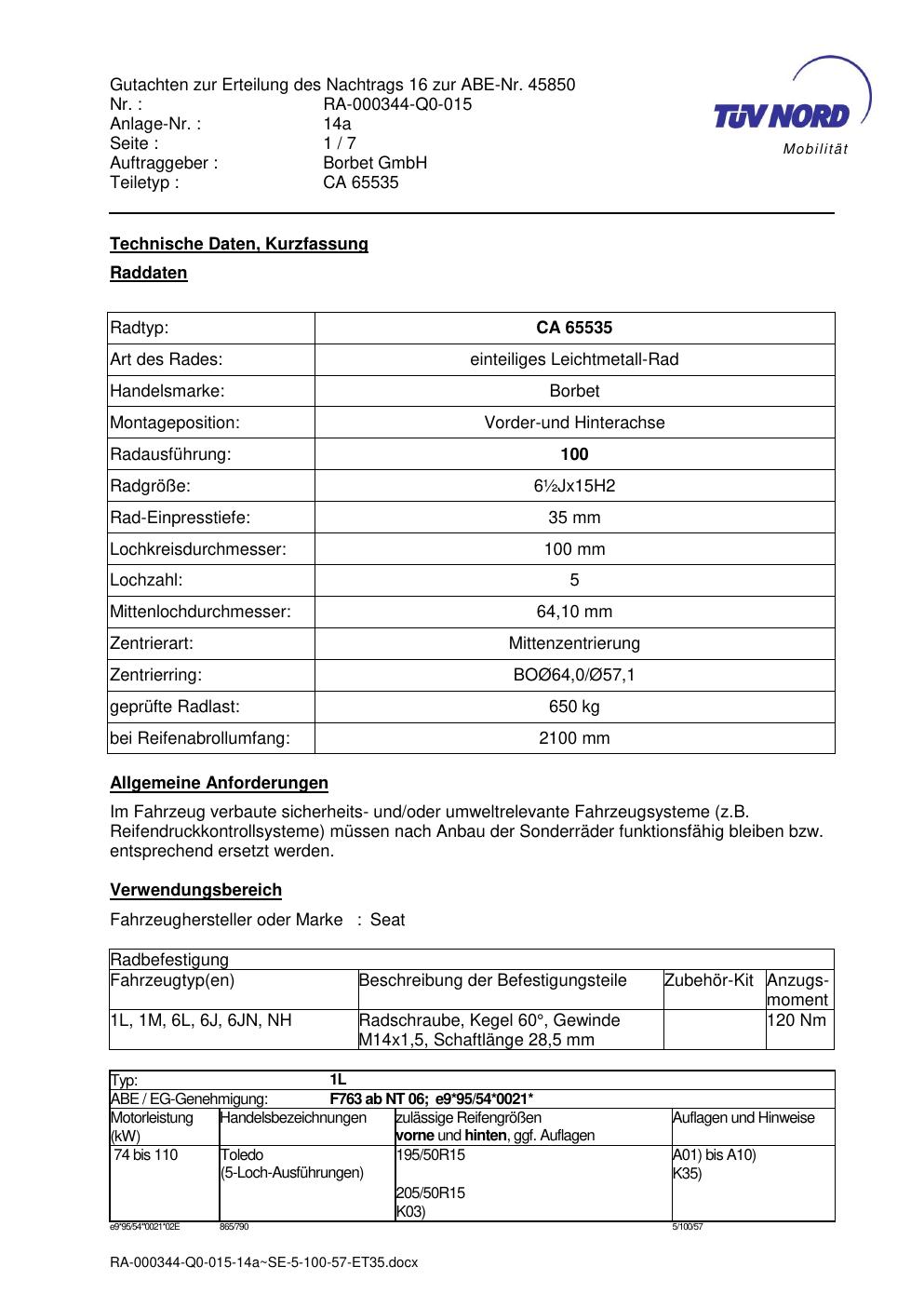Dieses Gutachten (abe) bezieht sich auf die Alufelge Borbet CA 65535 in der Ausführung ET 0, Mittenloch 0 mm (KBA 45850). Im PDF findest du typischerweise zulässige Reifengrößen, Auflagen/Anbauhinweise und – je nach Dokument – Hinweise zur Eintragung.