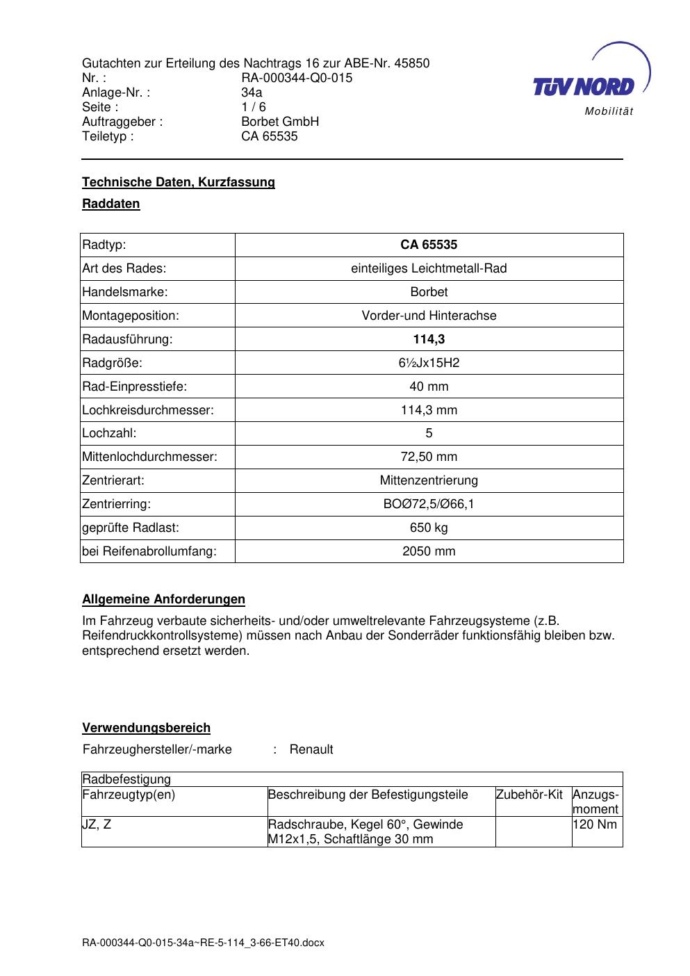 Dieses Gutachten (abe) bezieht sich auf die Alufelge Borbet CA 65535 in der Ausführung ET 0, Mittenloch 0 mm (KBA 45850). Im PDF findest du typischerweise zulässige Reifengrößen, Auflagen/Anbauhinweise und – je nach Dokument – Hinweise zur Eintragung.