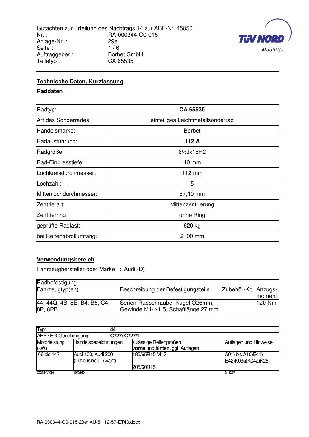 Dieses Gutachten (abe) bezieht sich auf die Alufelge Borbet CA 65535 in der Ausführung 7Jx15 ET 0, Mittenloch 0 mm (KBA 45850). Im PDF findest du typischerweise zulässige Reifengrößen, Auflagen/Anbauhinweise und – je nach Dokument – Hinweise zur Eintragung.