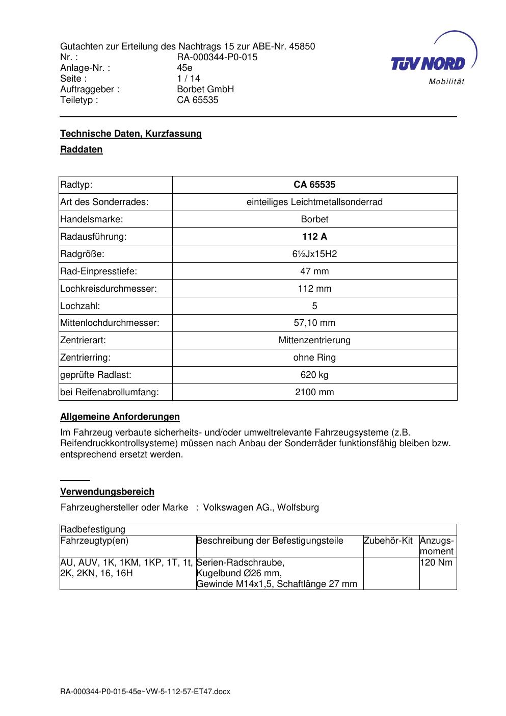 Dieses Gutachten (abe) bezieht sich auf die Alufelge Borbet CA 65535 in der Ausführung ET 0, Mittenloch 0 mm (KBA 45850). Im PDF findest du typischerweise zulässige Reifengrößen, Auflagen/Anbauhinweise und – je nach Dokument – Hinweise zur Eintragung.