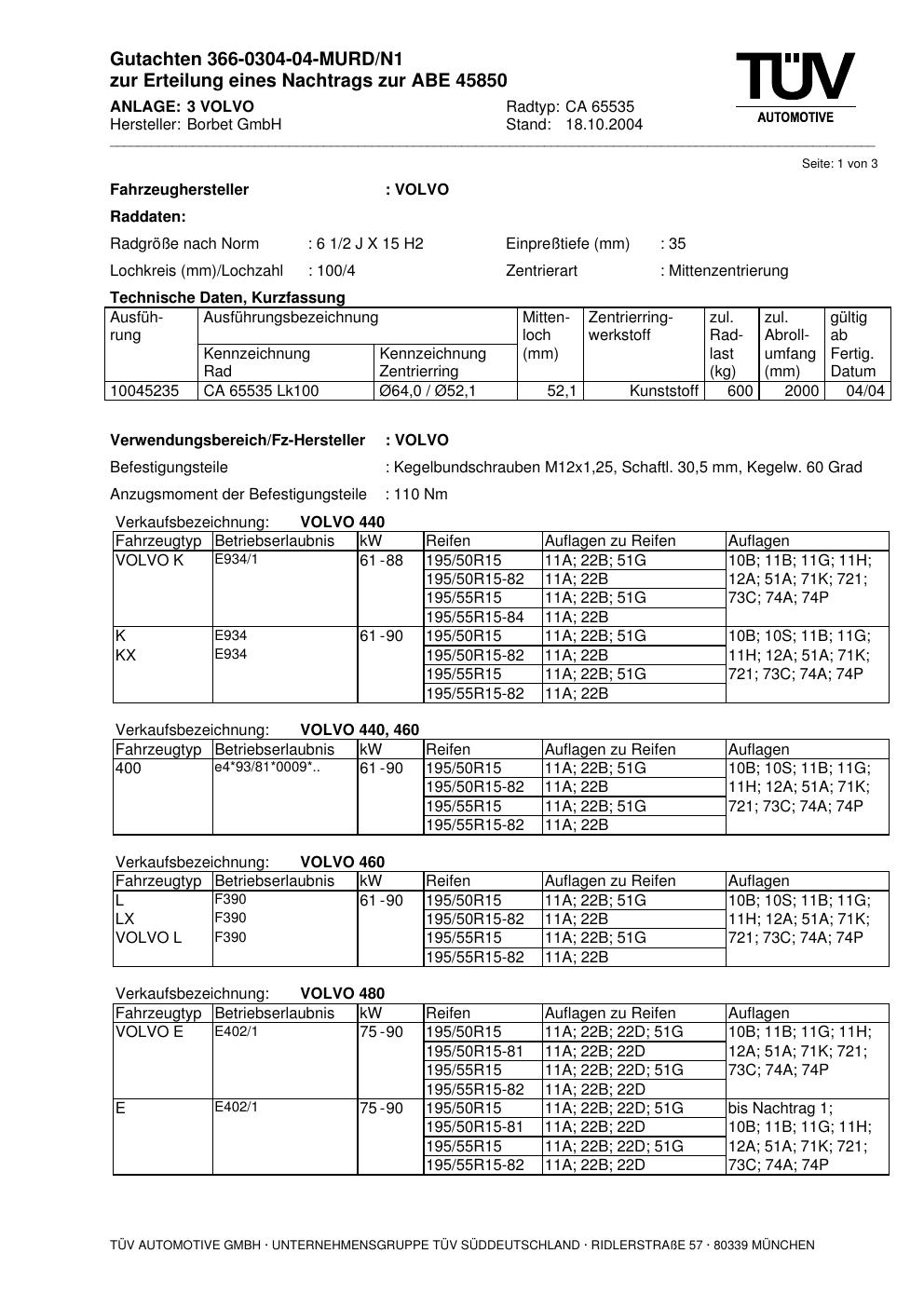 Dieses Gutachten (abe) bezieht sich auf die Alufelge Borbet CA 65535 in der Ausführung 2Jx15 ET 0, Mittenloch 0 mm (KBA 45850). Im PDF findest du typischerweise zulässige Reifengrößen, Auflagen/Anbauhinweise und – je nach Dokument – Hinweise zur Eintragung.