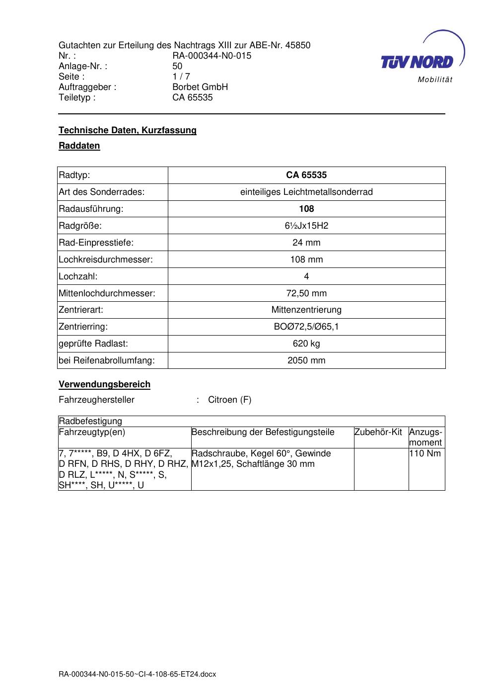 Dieses Gutachten (abe) bezieht sich auf die Alufelge Borbet CA 65535 in der Ausführung ET 0, Mittenloch 0 mm (KBA 45850). Im PDF findest du typischerweise zulässige Reifengrößen, Auflagen/Anbauhinweise und – je nach Dokument – Hinweise zur Eintragung.