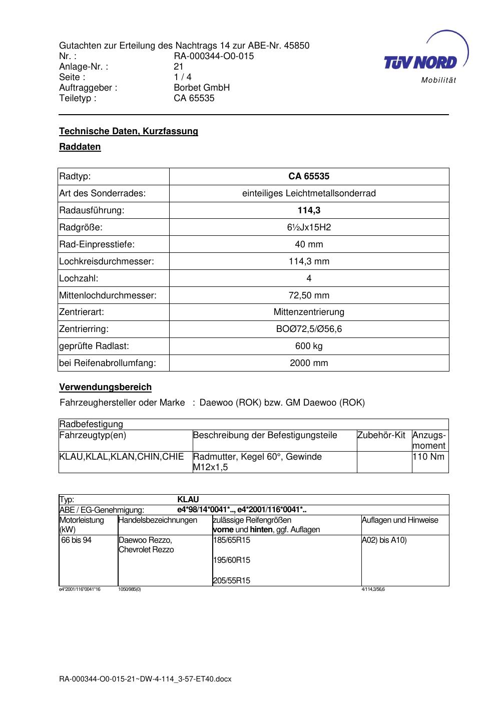 Dieses Gutachten (abe) bezieht sich auf die Alufelge brand-borbet CA 65535 in der Ausführung ET 0, Mittenloch 0 mm (KBA 45850). Im PDF findest du typischerweise zulässige Reifengrößen, Auflagen/Anbauhinweise und – je nach Dokument – Hinweise zur Eintragung.