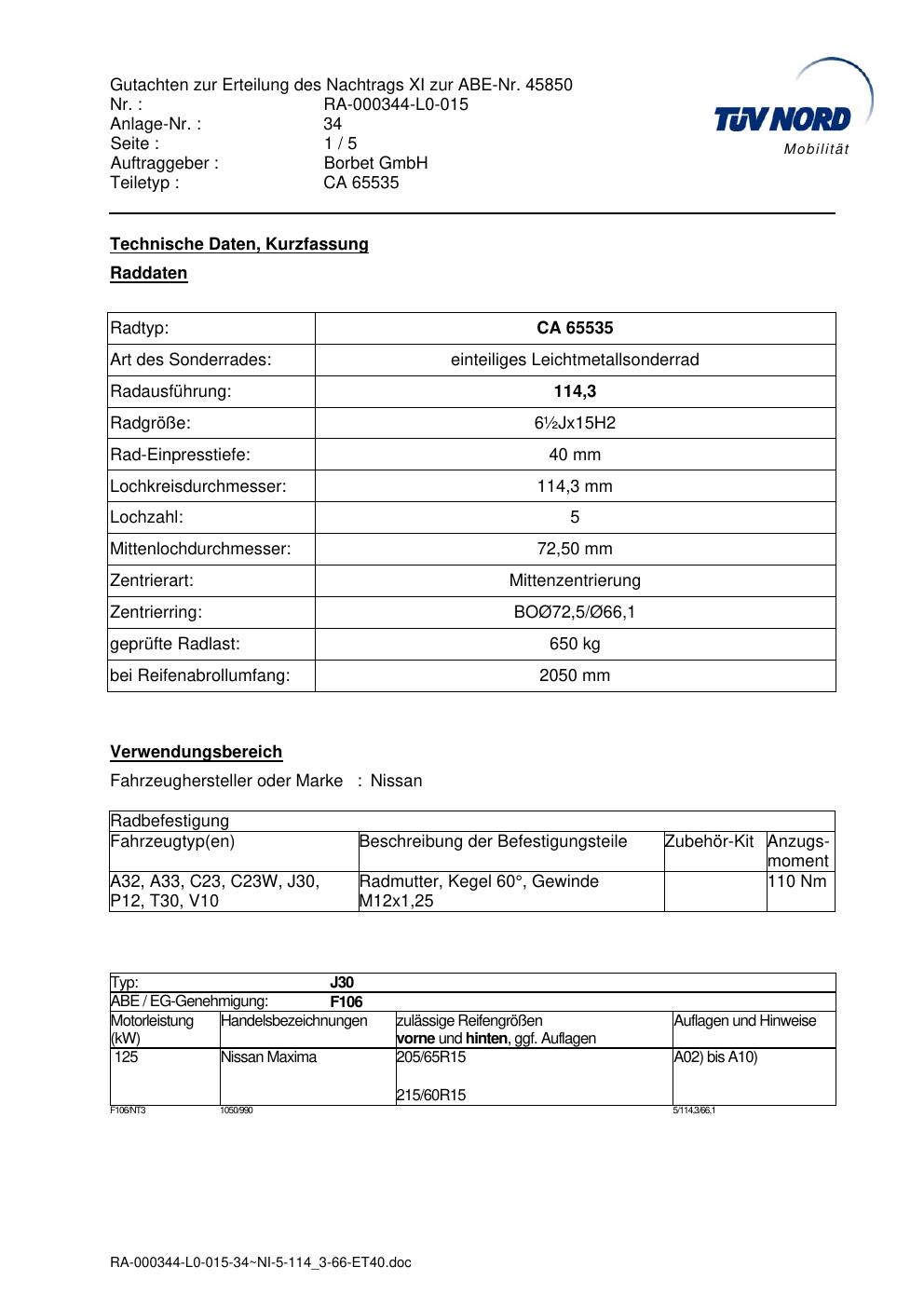 Dieses Gutachten (abe) bezieht sich auf die Alufelge Borbet CA 65535 in der Ausführung ET 0, Mittenloch 0 mm (KBA 45850). Im PDF findest du typischerweise zulässige Reifengrößen, Auflagen/Anbauhinweise und – je nach Dokument – Hinweise zur Eintragung.