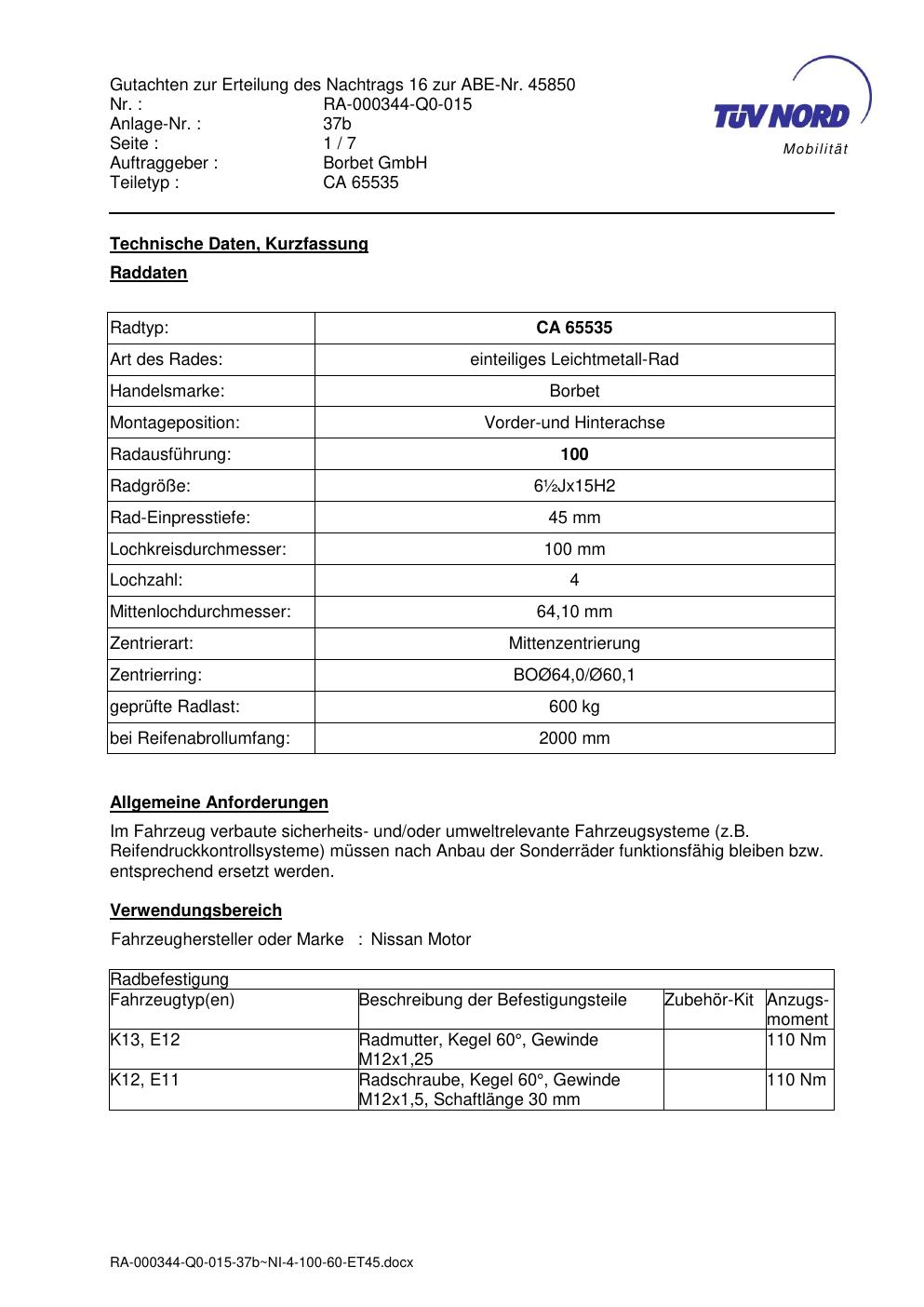 Dieses Gutachten (abe) bezieht sich auf die Alufelge brand-borbet CA 65535 in der Ausführung ET 0, Mittenloch 0 mm (KBA 45850). Im PDF findest du typischerweise zulässige Reifengrößen, Auflagen/Anbauhinweise und – je nach Dokument – Hinweise zur Eintragung.