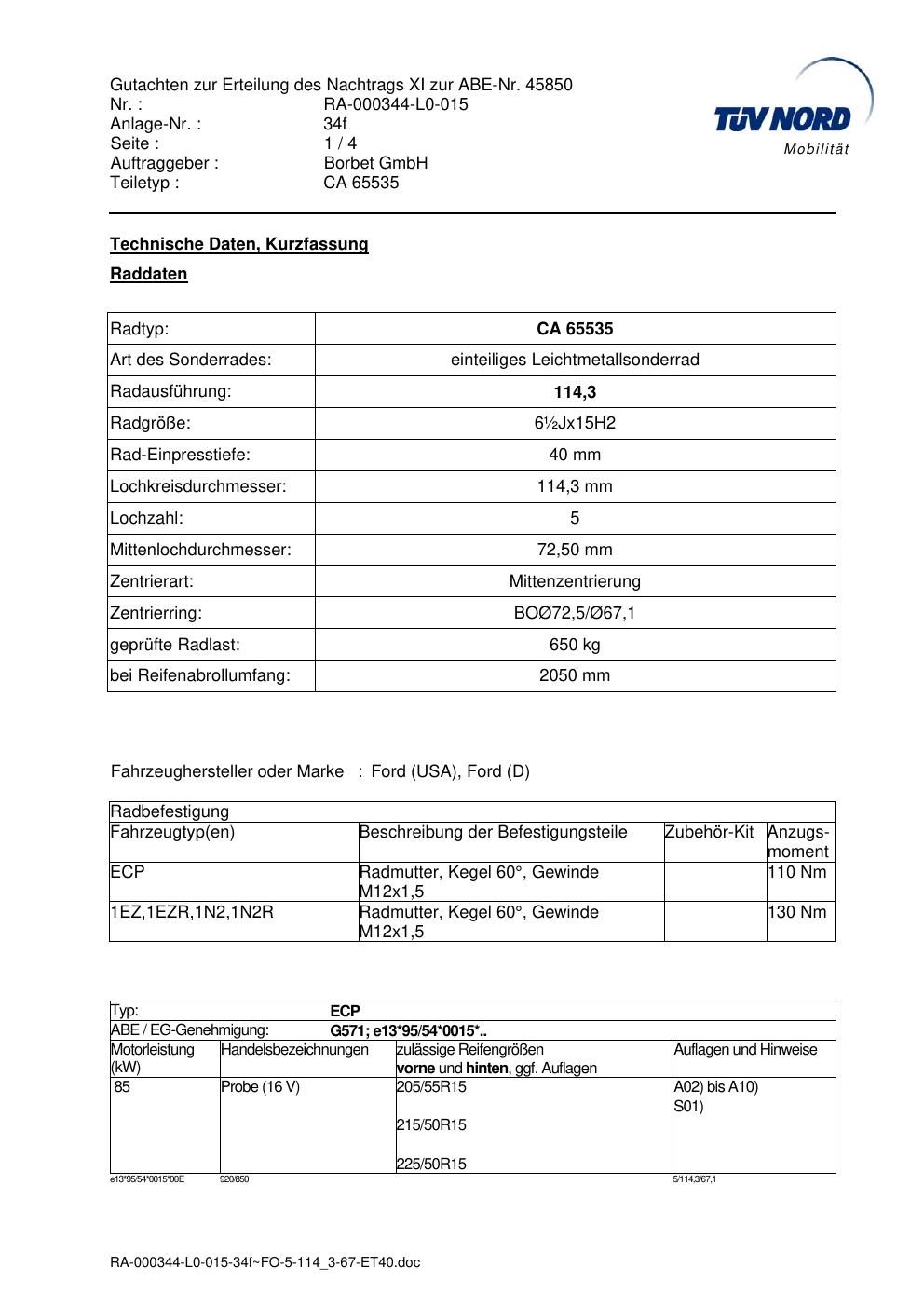 Dieses Gutachten (abe) bezieht sich auf die Alufelge Borbet CA 65535 in der Ausführung ET 0, Mittenloch 0 mm (KBA 45850). Im PDF findest du typischerweise zulässige Reifengrößen, Auflagen/Anbauhinweise und – je nach Dokument – Hinweise zur Eintragung.