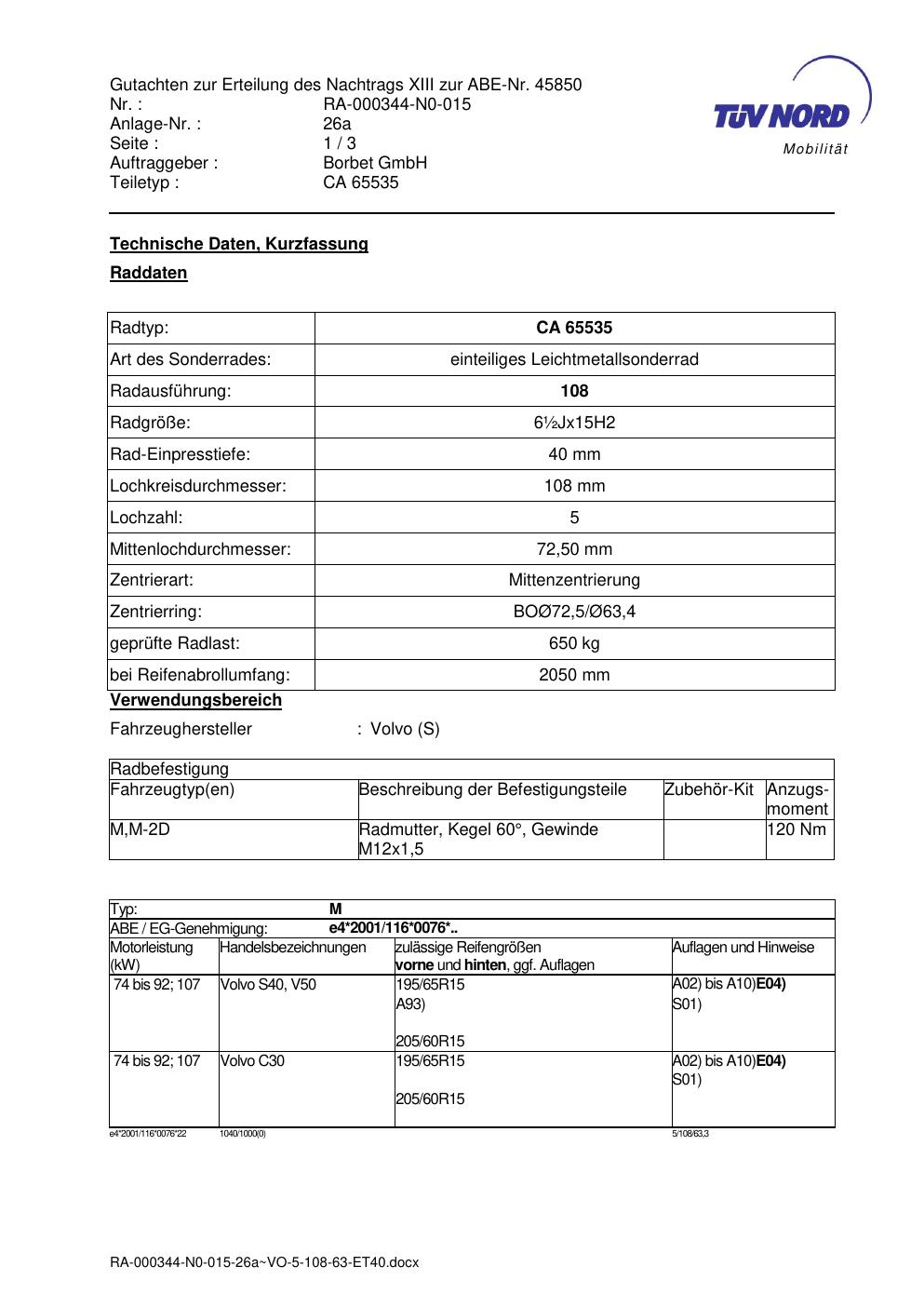 Dieses Gutachten (abe) bezieht sich auf die Alufelge brand-borbet CA 65535 in der Ausführung ET 0, Mittenloch 0 mm (KBA 45850). Im PDF findest du typischerweise zulässige Reifengrößen, Auflagen/Anbauhinweise und – je nach Dokument – Hinweise zur Eintragung.