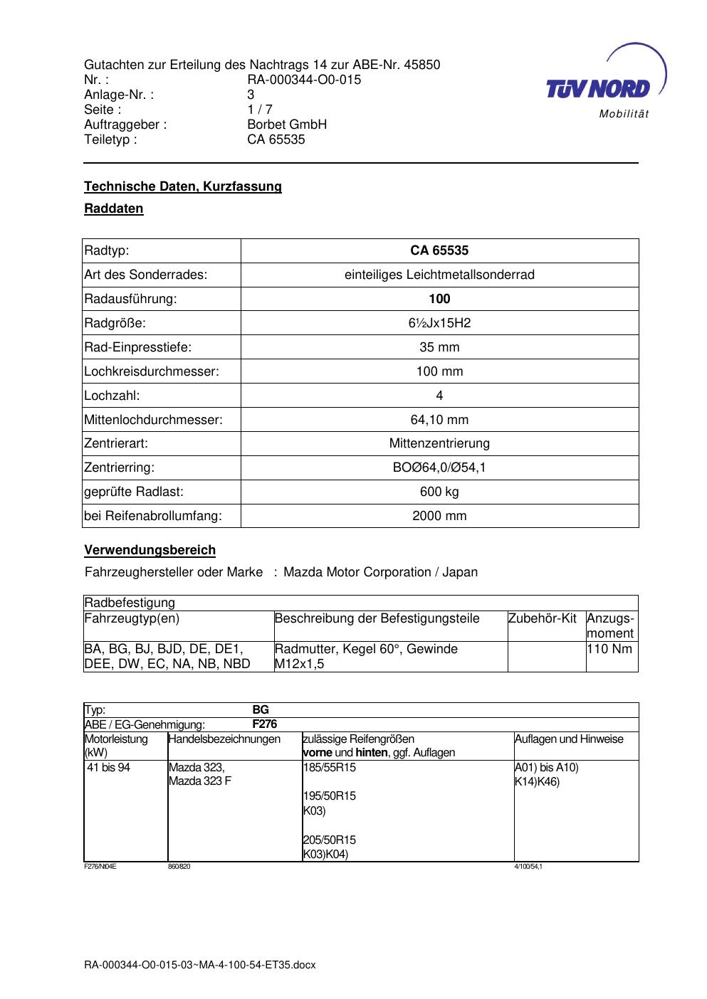 • Stimmt die KBA-Nummer auf der Felge mit diesem Dokument überein?